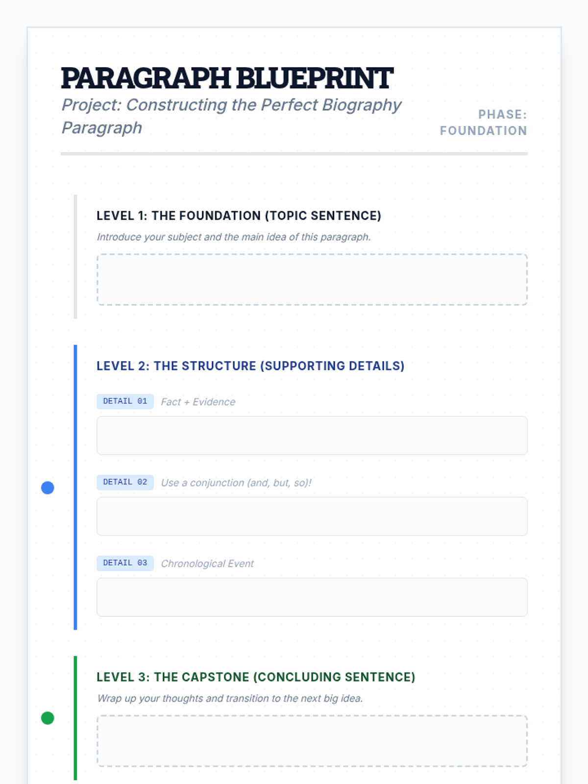 A 10-session unit for 5th graders focusing on the transition from paragraph to essay writing through the lens of biography. The unit covers sentence variety, chronological sequencing, paragraph structure, and grammar, tailored for small group instruction with differentiated support.