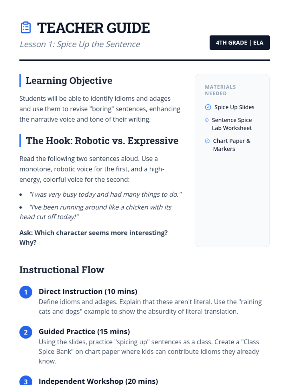 A 4th-grade ELA sequence focused on mastering idioms and adages through etymology, gamification, and interactive challenges. Students explore the history of common phrases and compete in team-based activities to build vocabulary fluency.