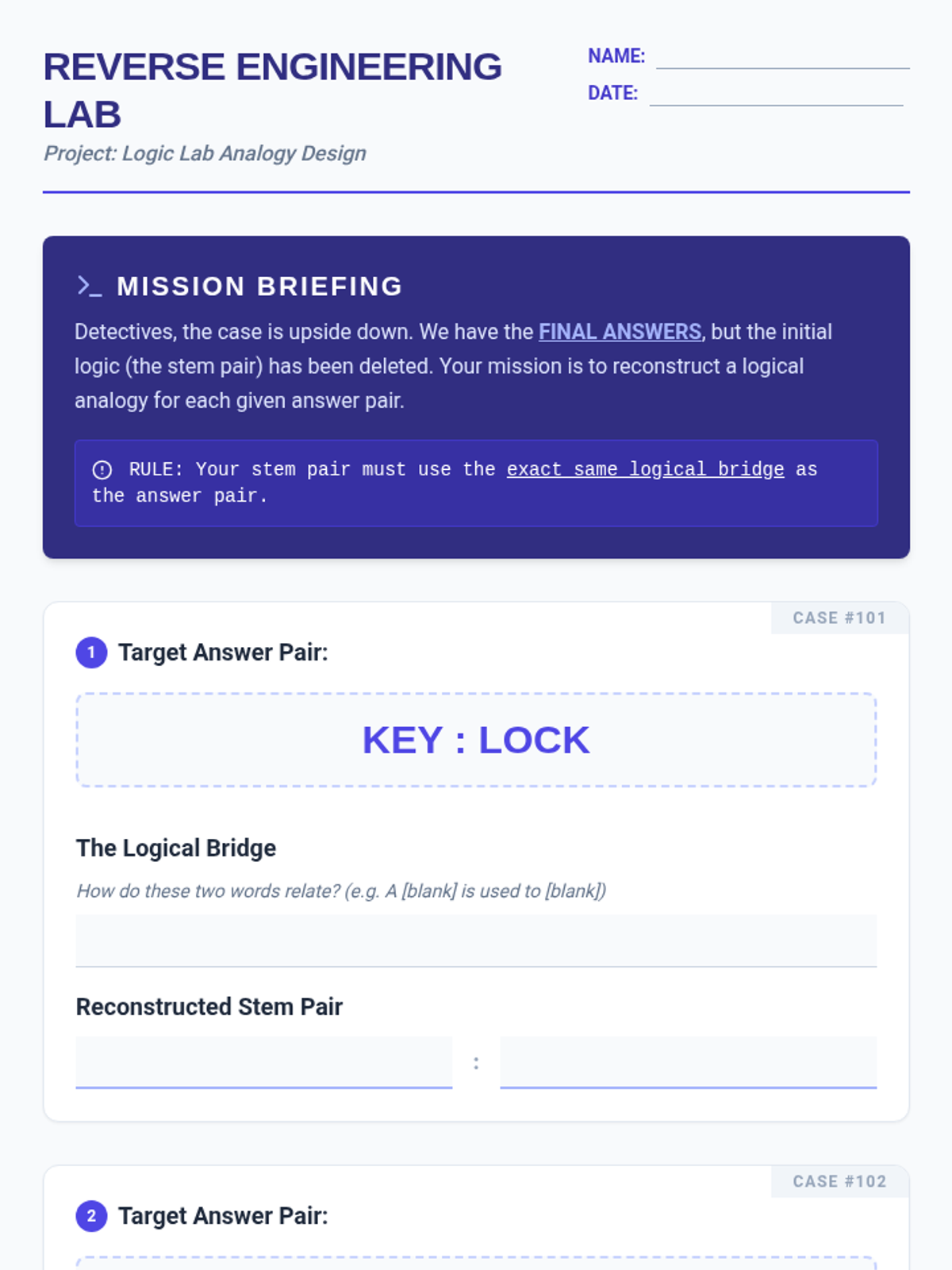 A project-based unit where 7th-grade students master analogies by reverse-engineering them, designing plausible distractors, and creating a class-wide logic puzzle book. Students transition from solving analogies to constructing them using cross-curricular vocabulary.