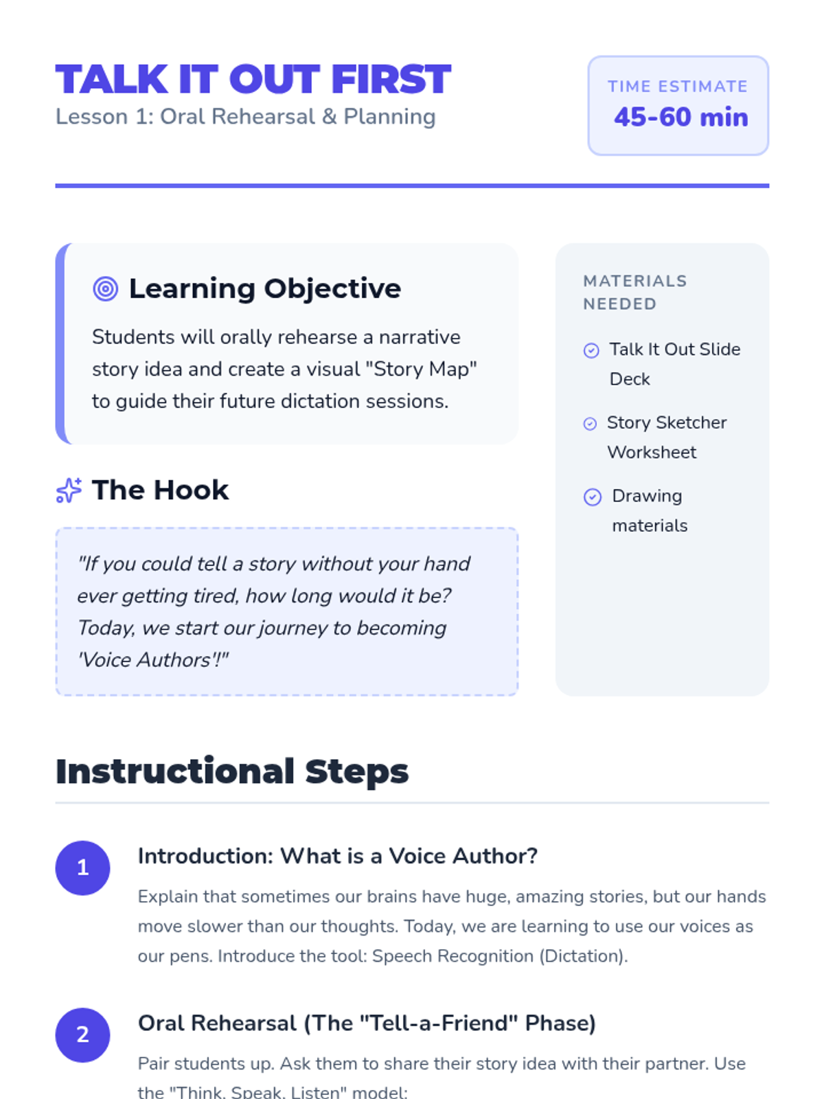 A 5-lesson sequence for 2nd-grade students exploring narrative writing through speech-to-text technology. Students learn oral rehearsal, dictation commands, and descriptive storytelling to bridge the gap between their imagination and the page.