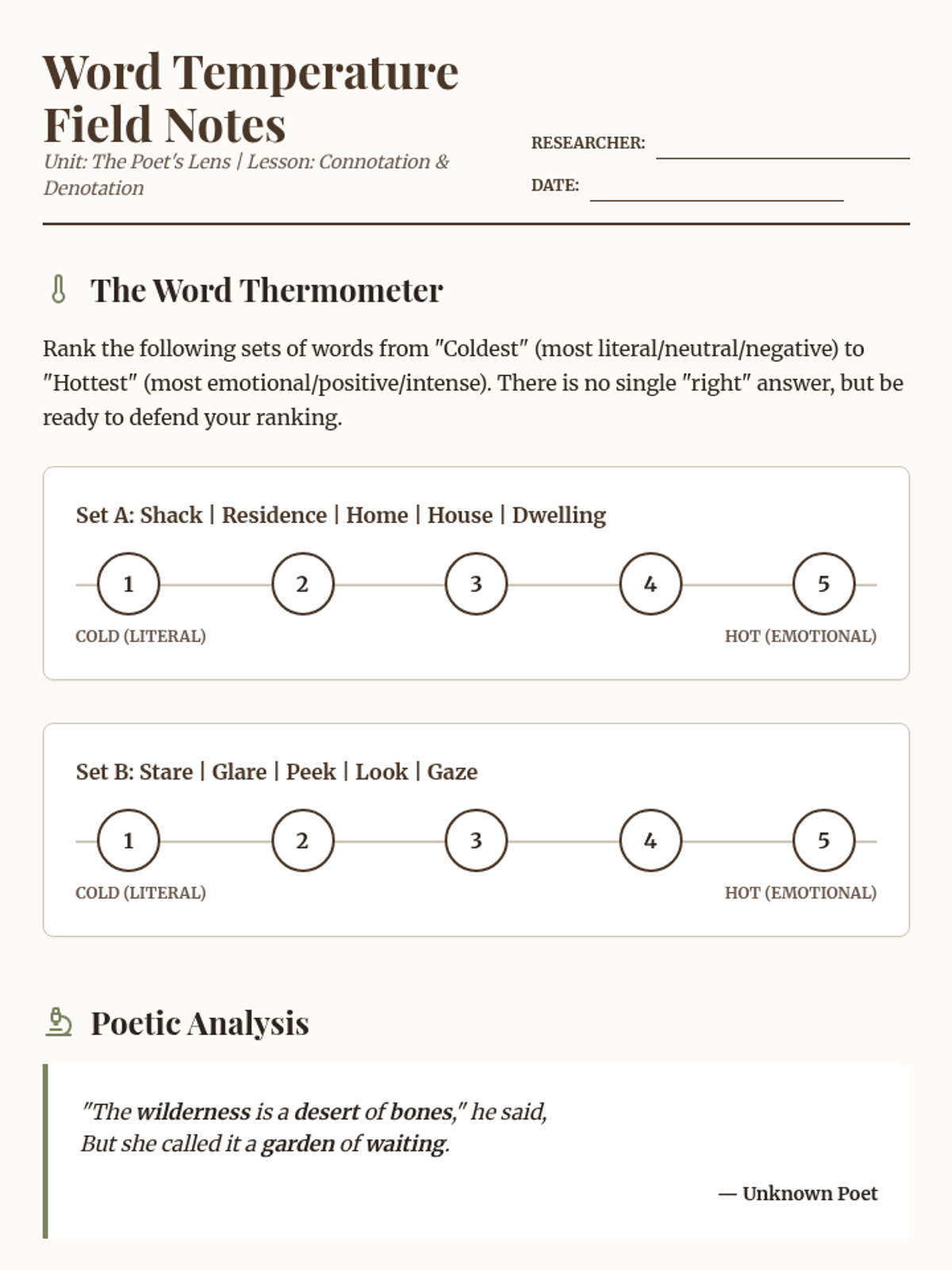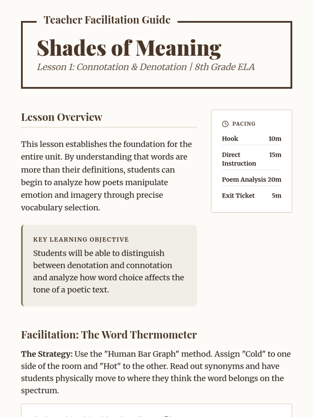 This 8th-grade sequence explores the depth of figurative language and imagery in poetry. Students move from understanding word connotations to deconstructing extended metaphors, analyzing personification, and interpreting complex symbols in a Socratic Seminar setting.