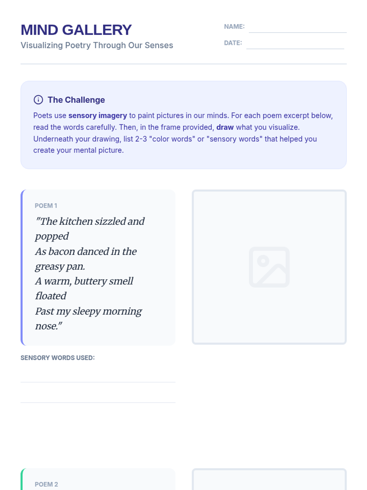 An inquiry-based exploration of figurative language and sensory imagery for 3rd graders. Students learn to decode similes, metaphors, and personification to unlock deeper meaning in poetry through visualization and analysis.