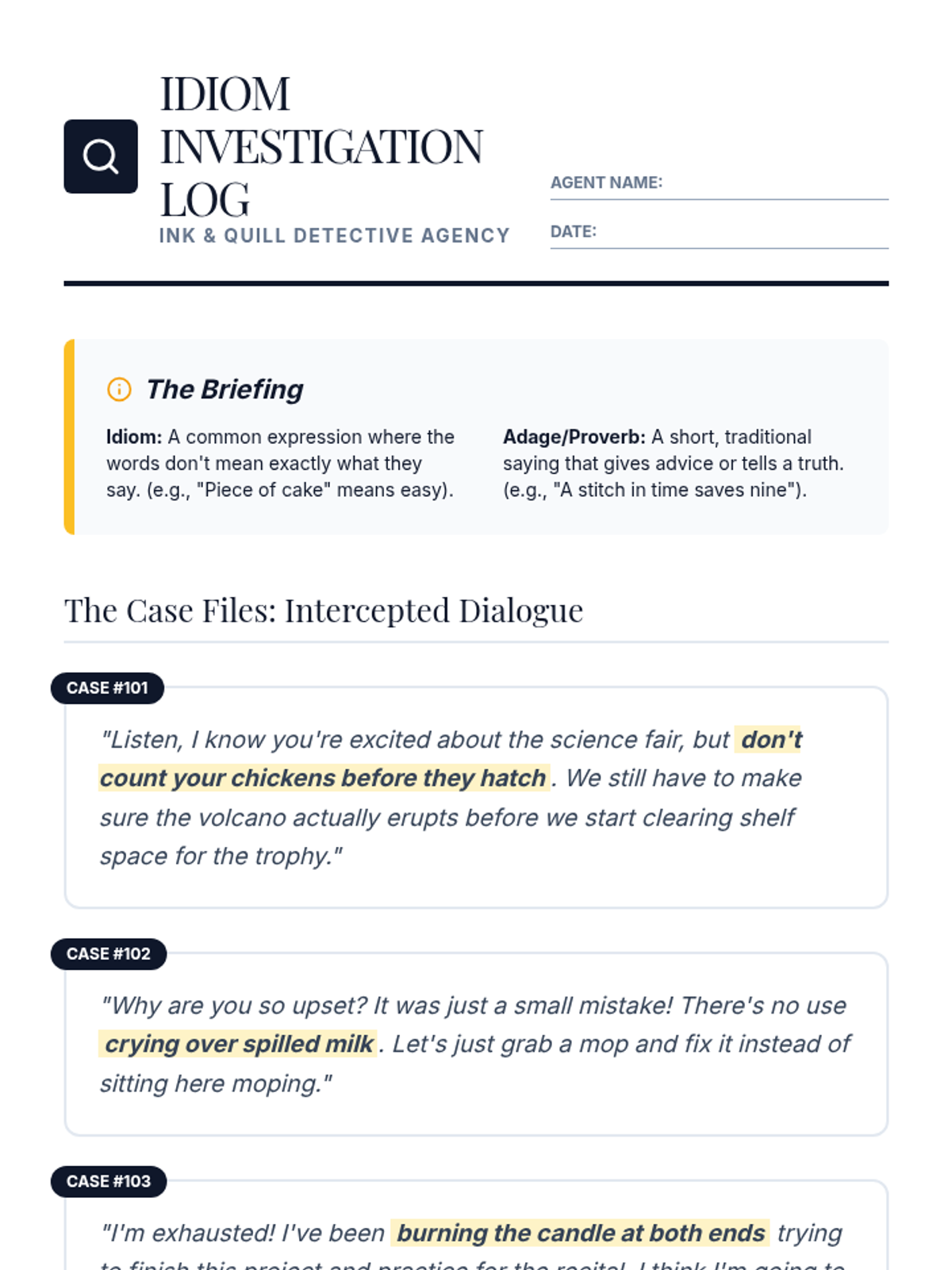 A 5th-grade ELA unit where students become 'language detectives' to investigate idioms and adages, eventually using them to craft vivid narrative dialogue and character voices.