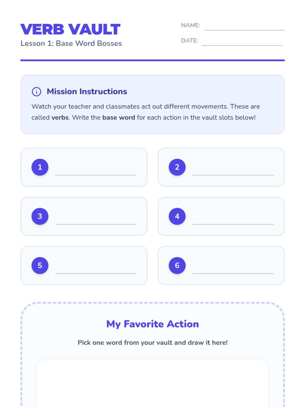 A comprehensive 1st-grade ELA sequence exploring how suffixes -ed and -ing change action words to show when they happen. Students use games, timelines, and narrative writing to master past and present continuous tenses.