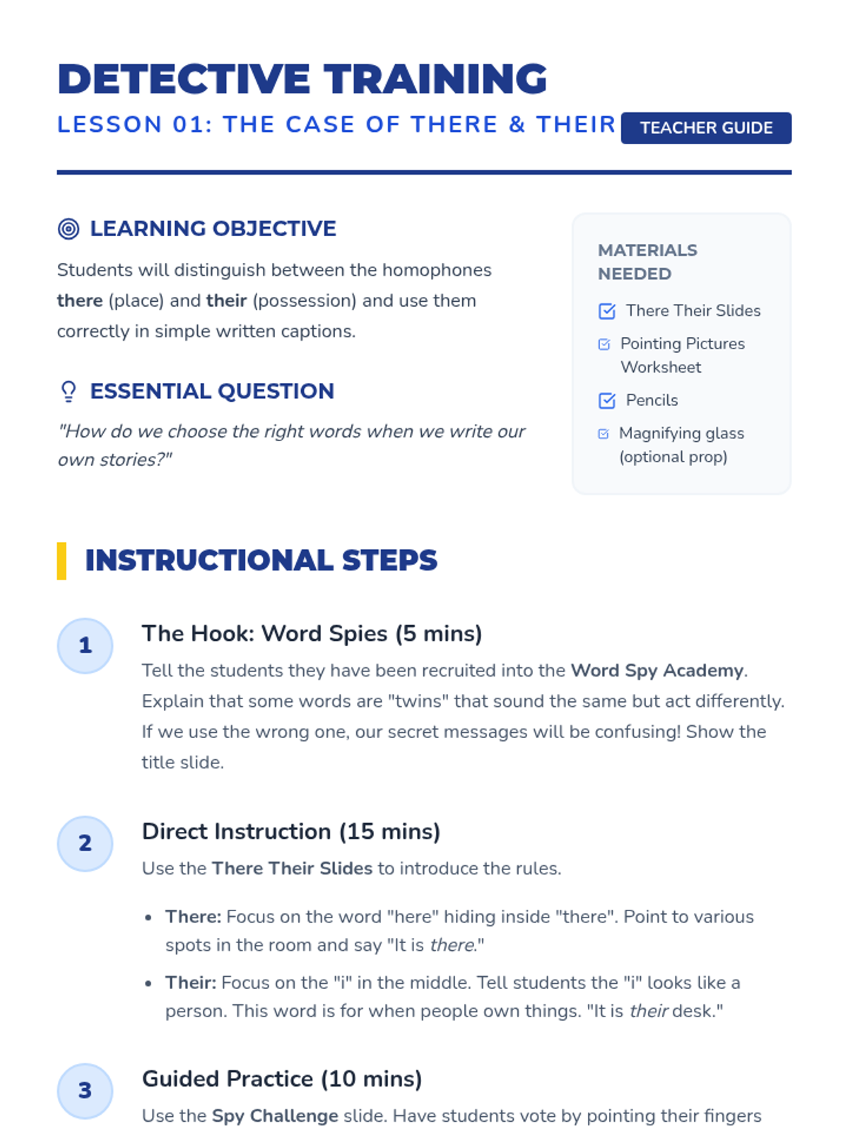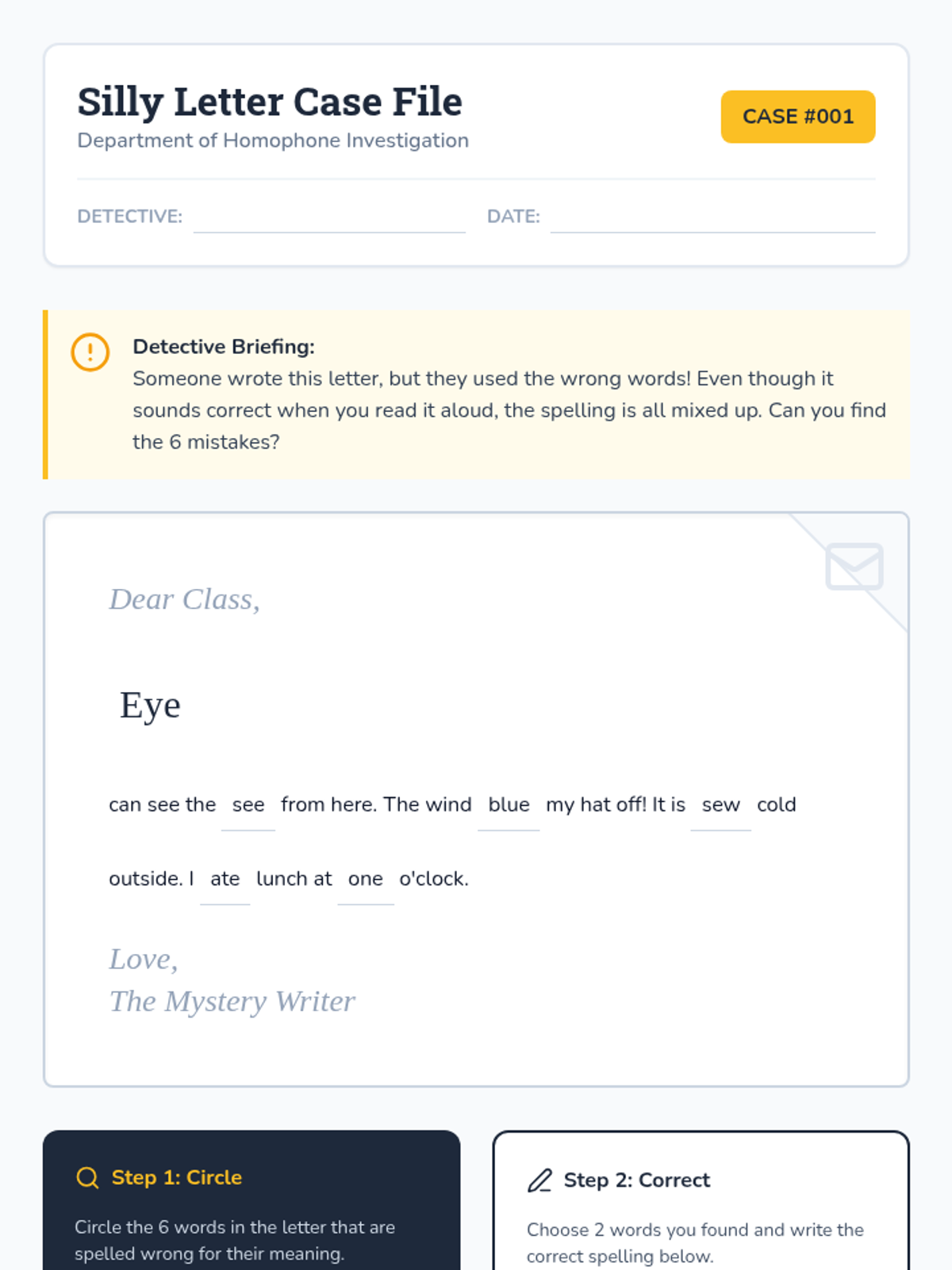 A 1st-grade ELA sequence where students become 'Word Detectives' to identify and correct homophones like no/know and right/write in context. Through inquiry and hands-on investigation, students learn why spelling matters for meaning.