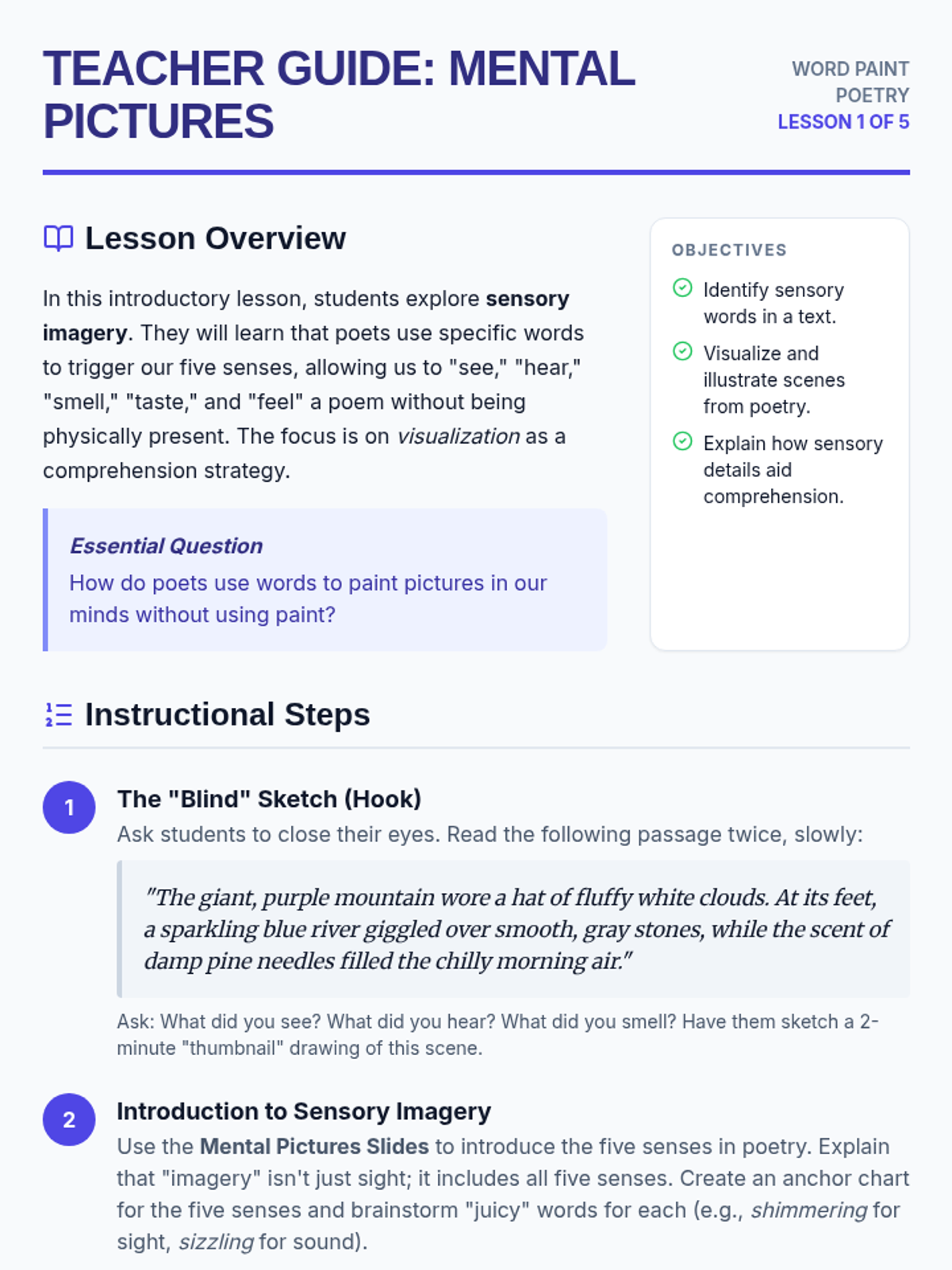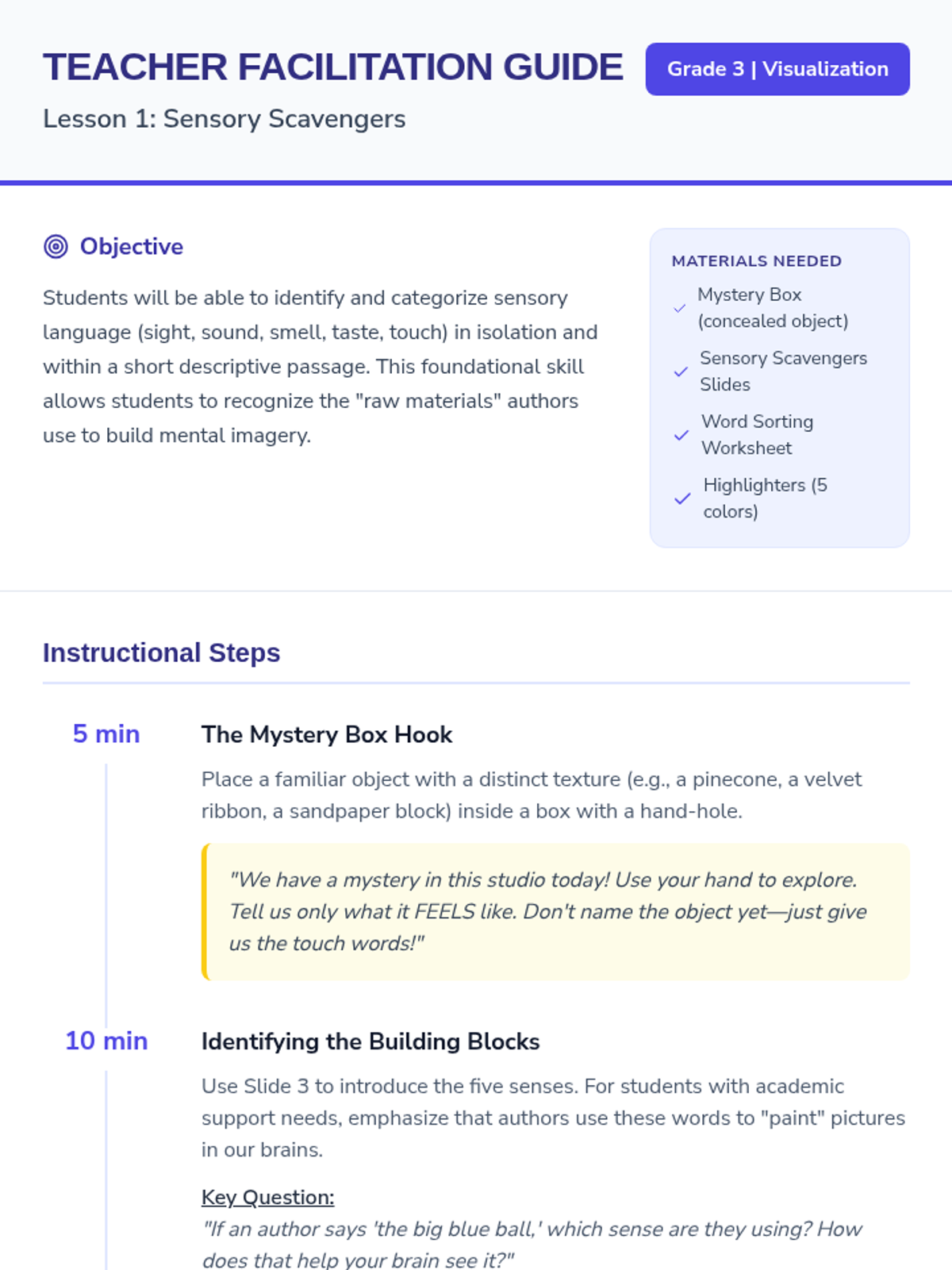A 5-lesson sequence for 3rd-grade students focused on building mental imagery skills through sensory language. Students progress from identifying sensory words to constructing and verbalizing full mental scenes.