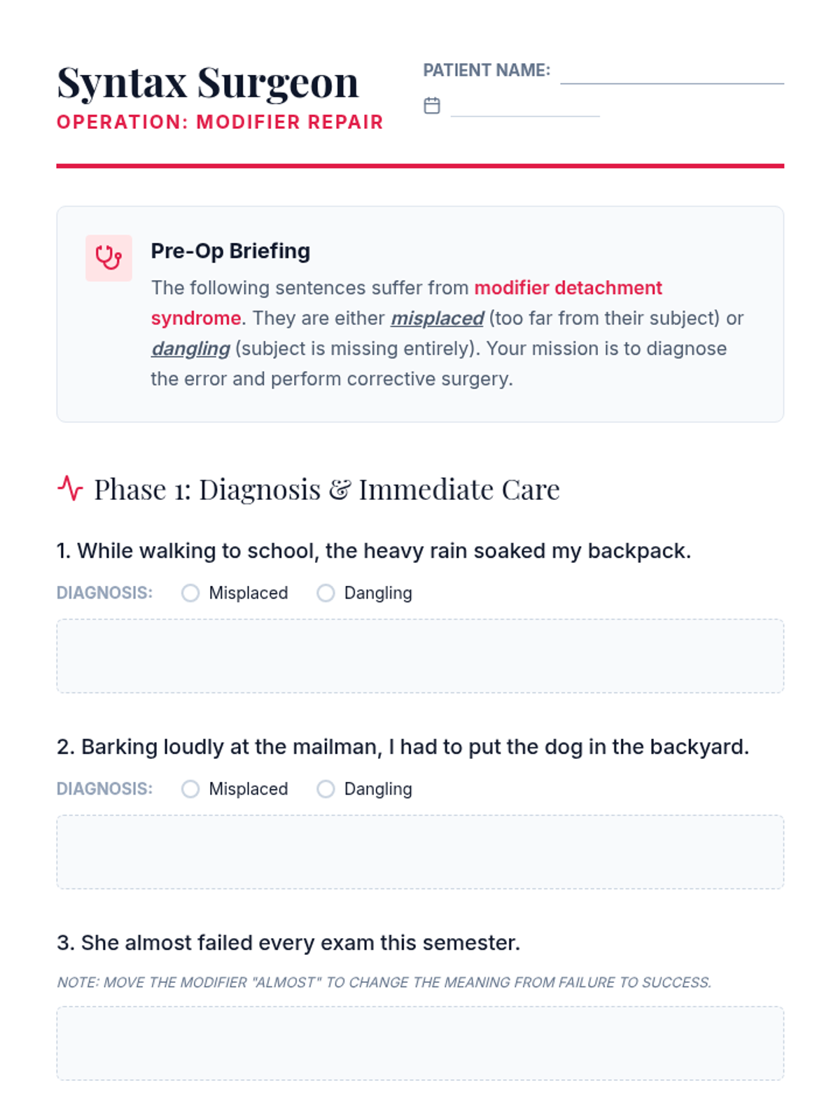 An advanced 12th-grade sequence on the rhetorical application of modifiers. Students progress from correcting syntactical errors (misplaced/dangling modifiers) to mastering stylistic control, focusing on precision, economy of language, and the impact of modifiers on tone and pacing in professional writing.
