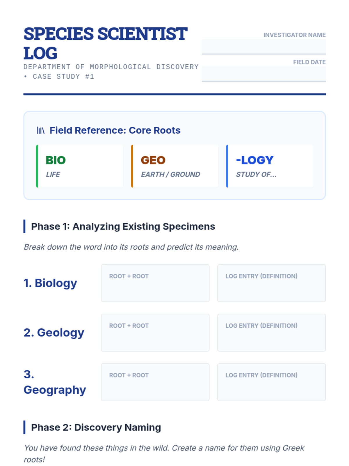 A project-based exploration of Greek and Latin roots where students act as 'Morpho Makers', synthesizing word parts to name scientific discoveries and futuristic inventions. Students move from analyzing scientific nomenclature to creating their own morphologically accurate terms for new concepts.