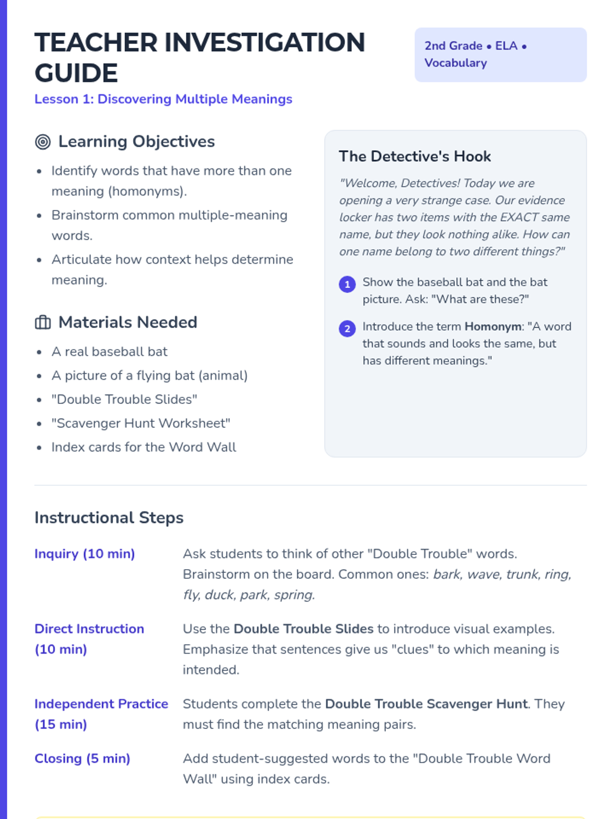 A 5-lesson 4th-grade ELA sequence where students become 'Word Detectives' to investigate homophones and homonyms through context clues, moving from identifying ambiguity to creating their own vocabulary riddles.