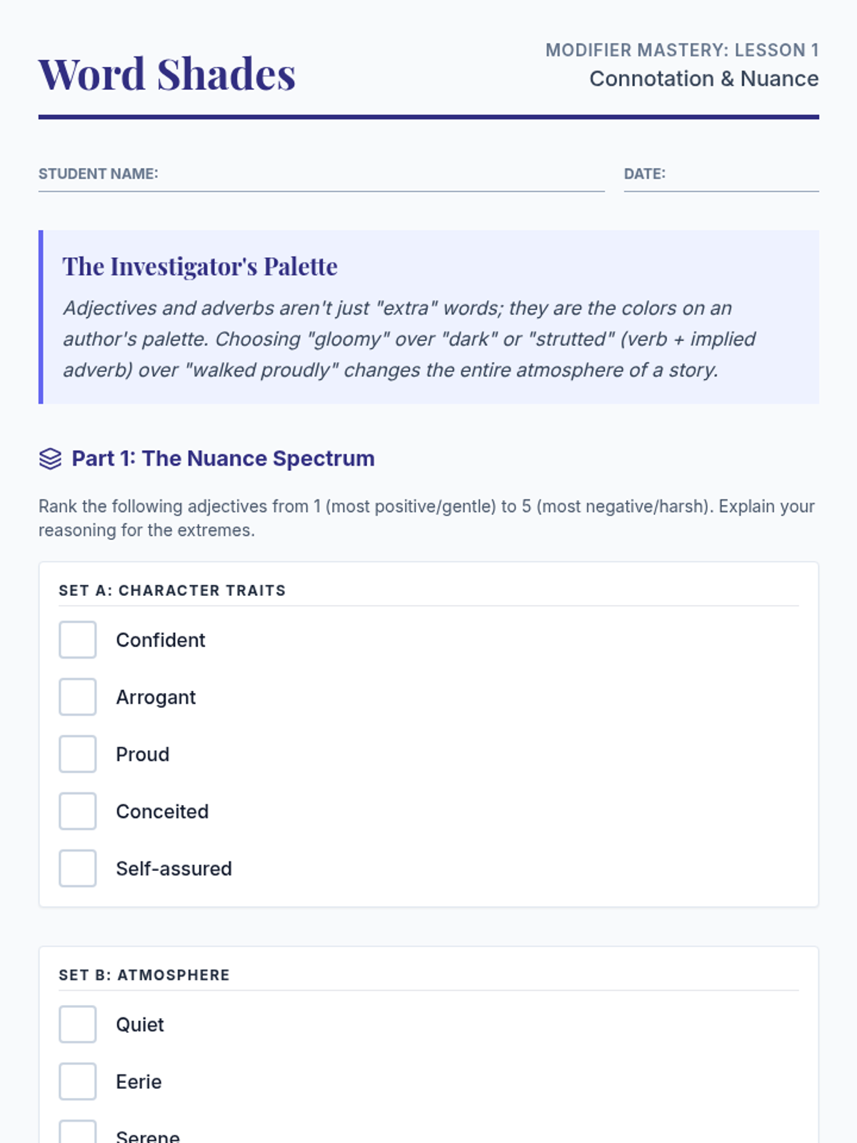 A high school ELA sequence exploring how adjectives and adverbs function as rhetorical tools to shape tone, atmosphere, and narrator reliability. Students progress from analyzing simple connotations to writing full rhetorical analyses of modifier choices in classic and modern texts.