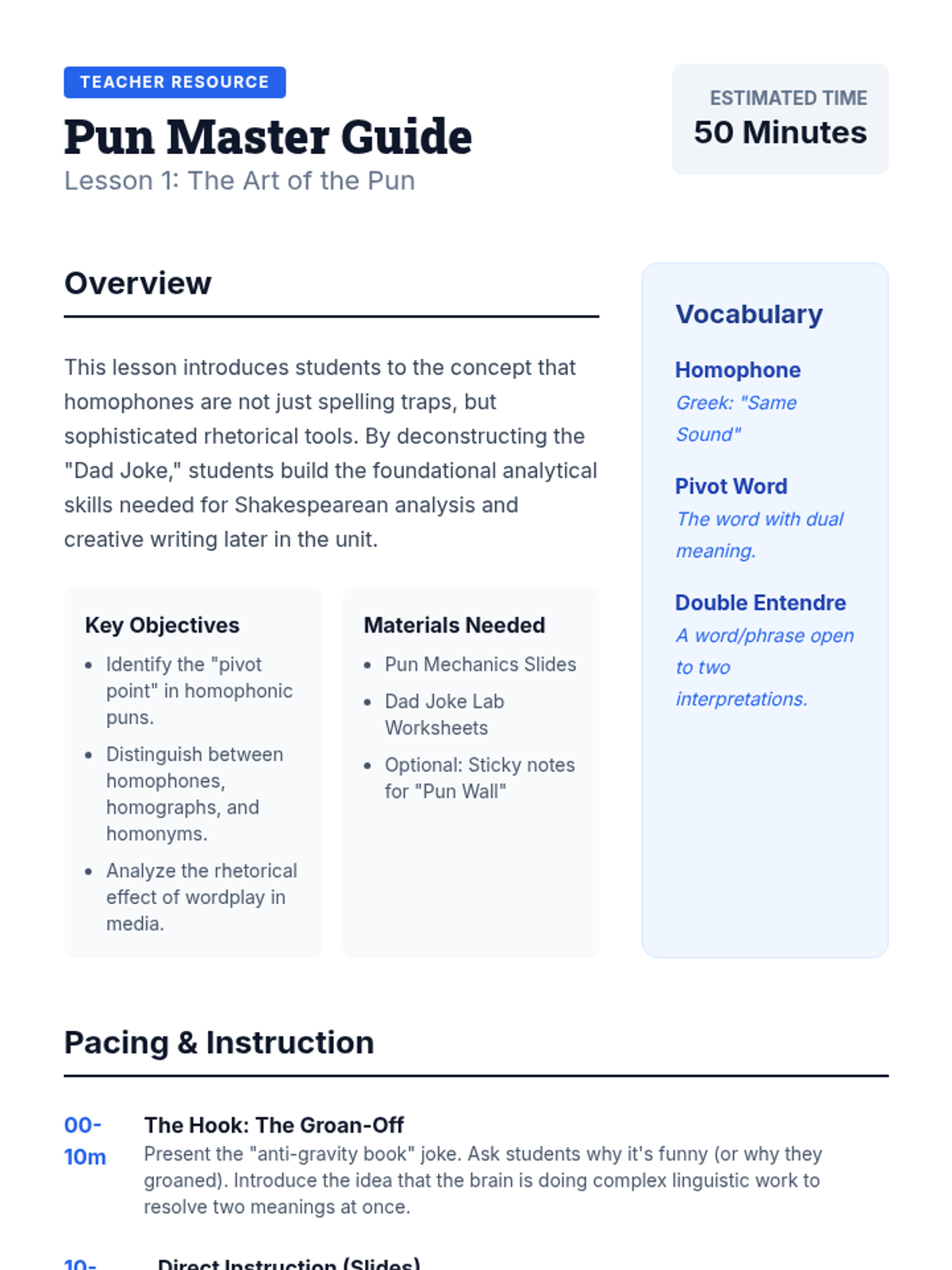 A project-based unit exploring the rhetorical and creative power of homophones. Students analyze puns, Shakespearean wit, and media headlines before crafting their own homophone-centric creative writing.