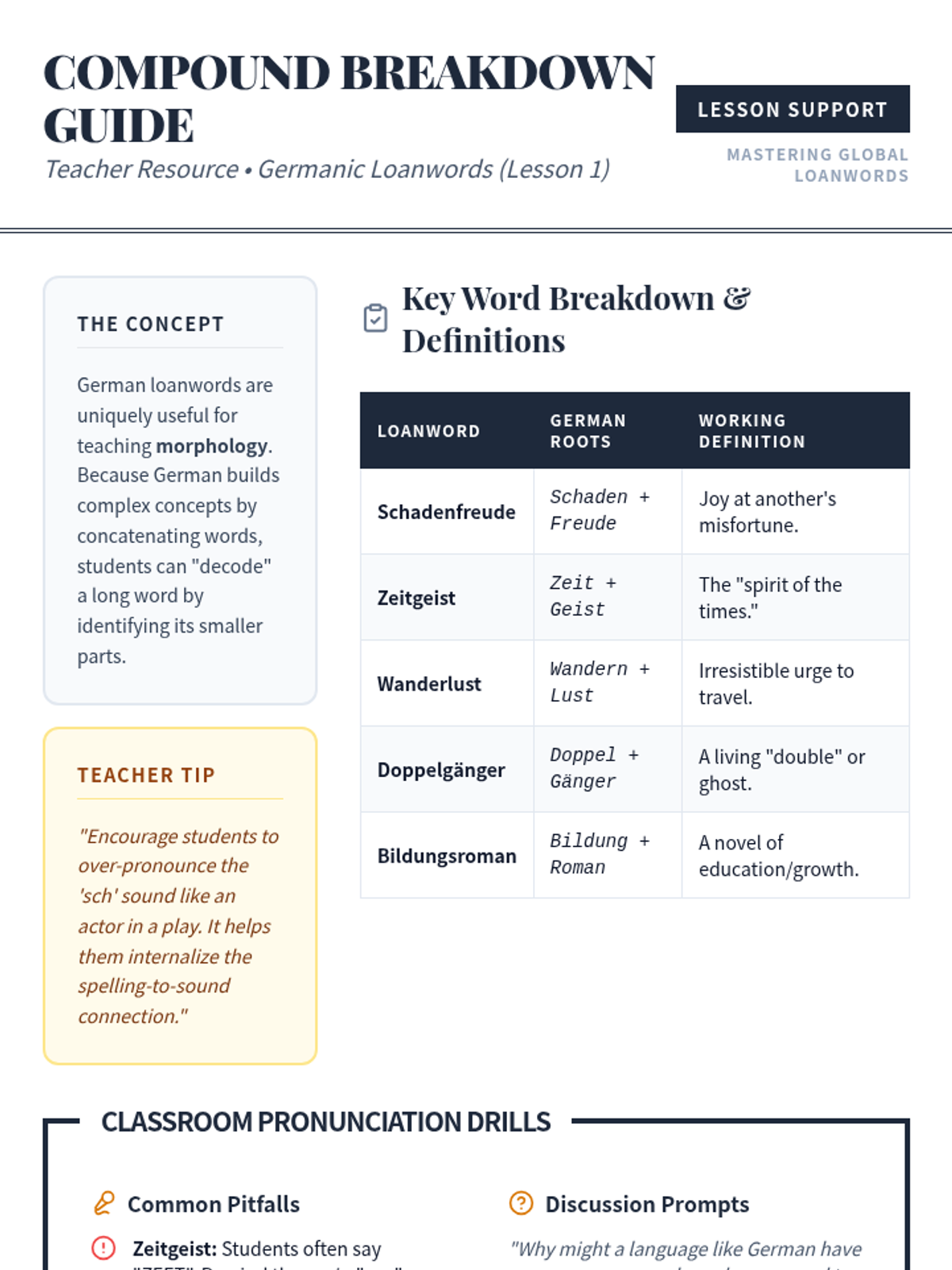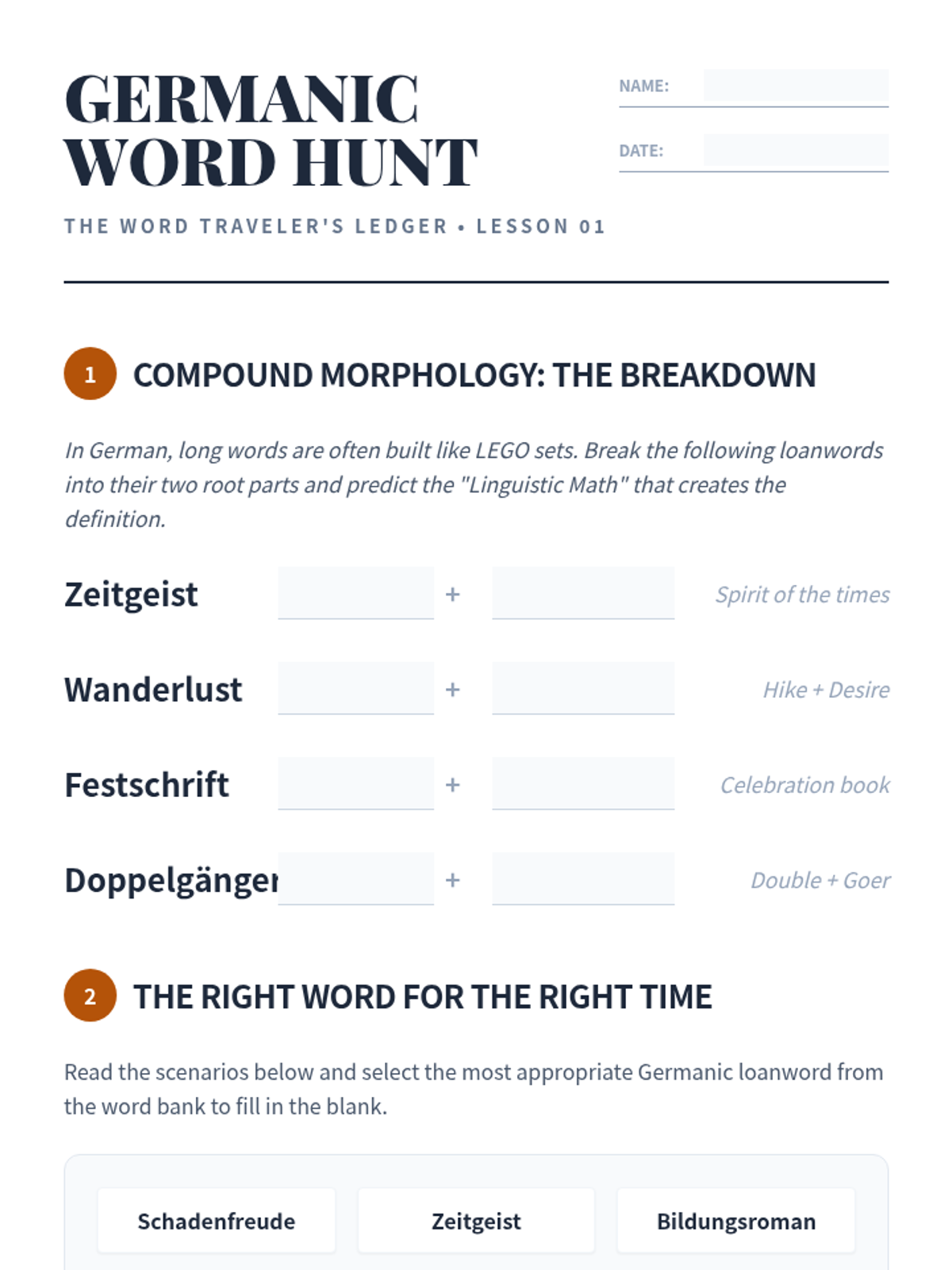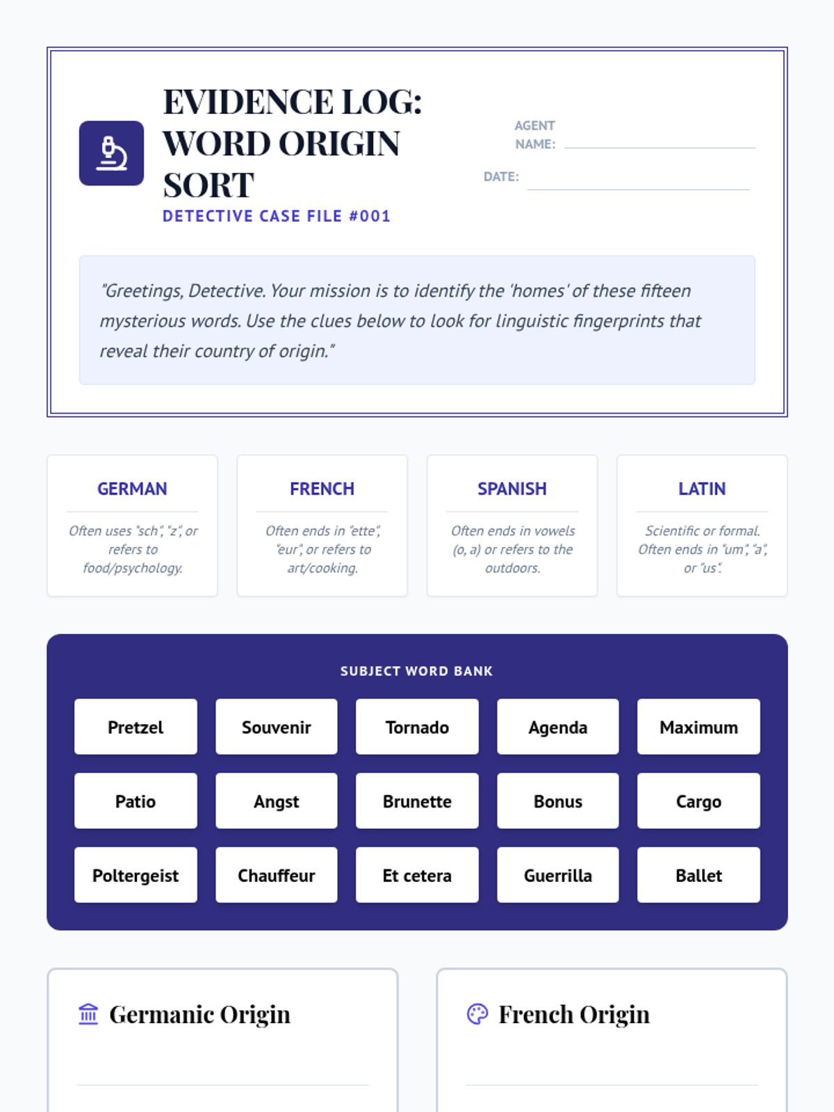 This sequence explores loanwords from German, Spanish, Italian, and Yiddish, focusing on their cultural origins, tricky orthography, and precise meanings. Students will engage in morphological analysis, categorization, and inquiry-based research to master these linguistic imports.