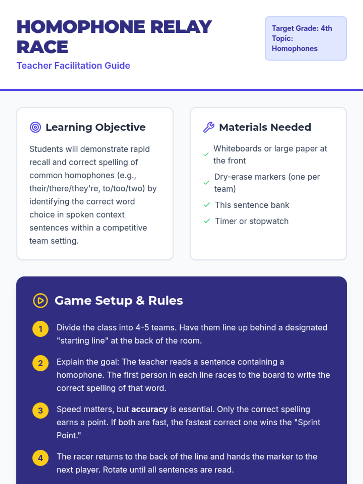 A high-energy, gamified series of lessons designed to build 4th graders' mastery of homophones and homonyms through relays, charades, and escape-room challenges. Students develop rapid recall and auditory discrimination skills while competing in team-based vocabulary games.