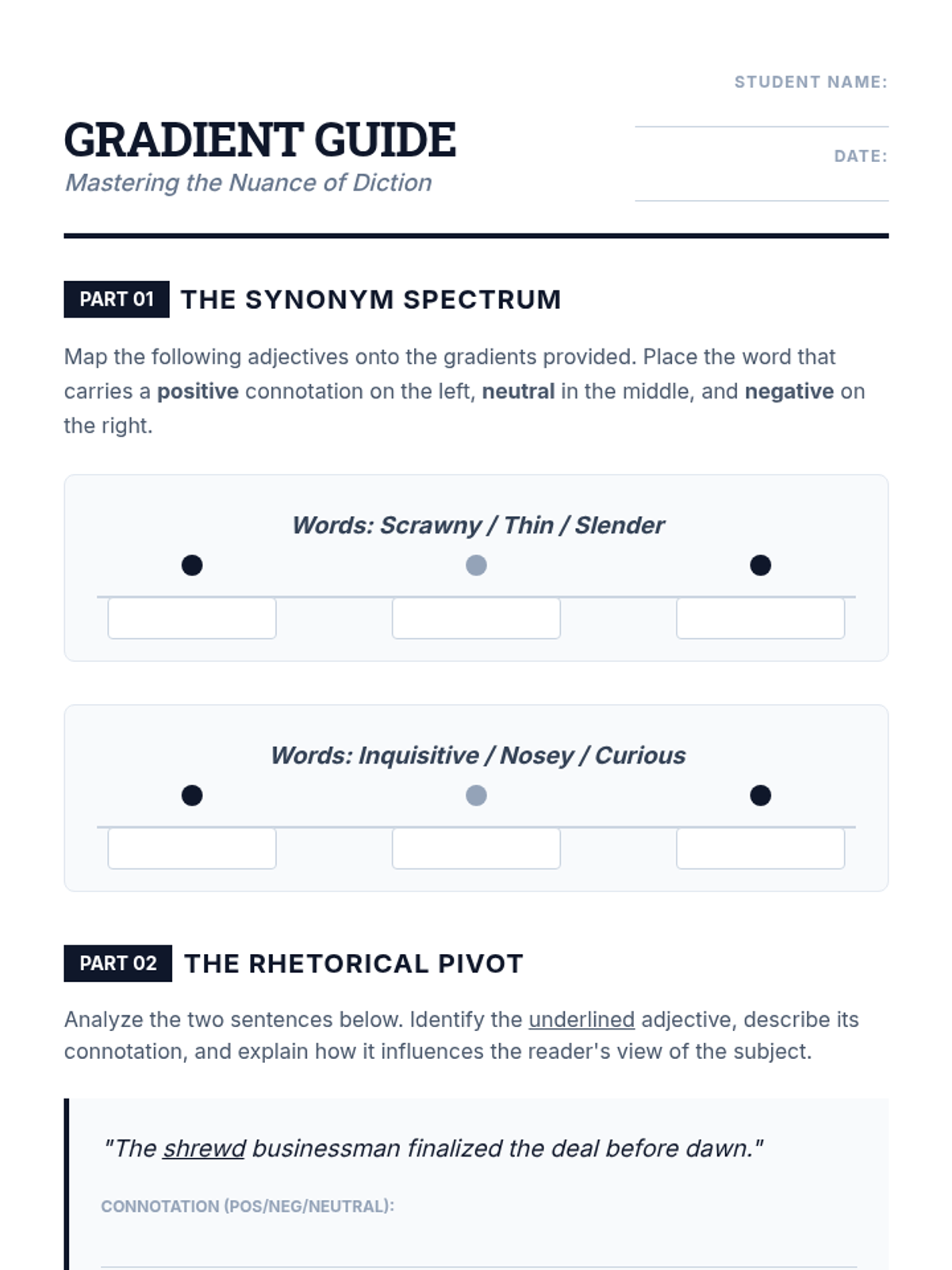 An advanced ELA sequence for 12th graders focused on the rhetorical and syntactic power of adjectives. Students progress from analyzing connotation and nuance to mastering complex structures like cumulative, coordinate, and compound adjectives, ultimately refining their own prose for economy and sensory precision in college-level writing.