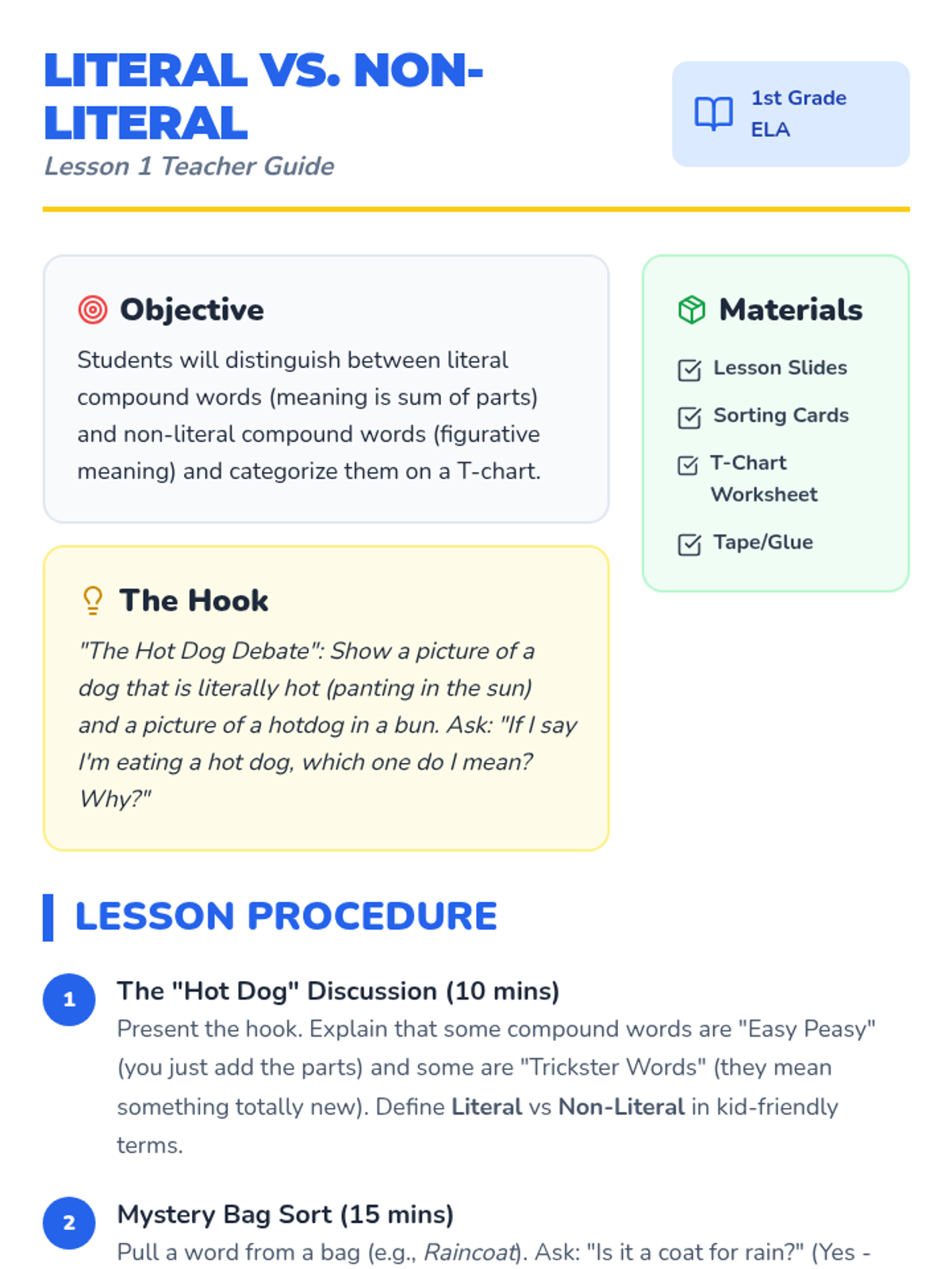 A 1st Grade ELA sequence focused on applying compound word meanings in context. Students explore literal vs. non-literal meanings, use context clues, perform 'sentence surgery', and write descriptive sentences to master compound words.