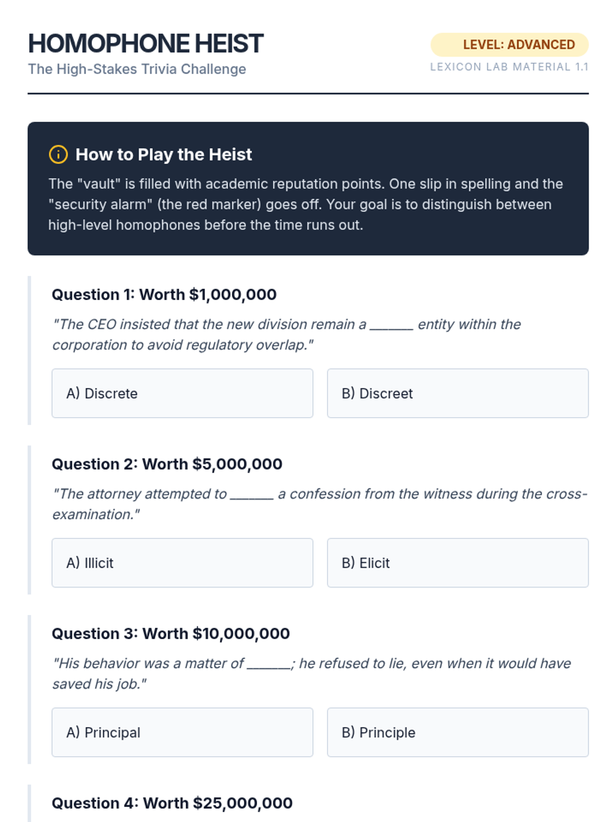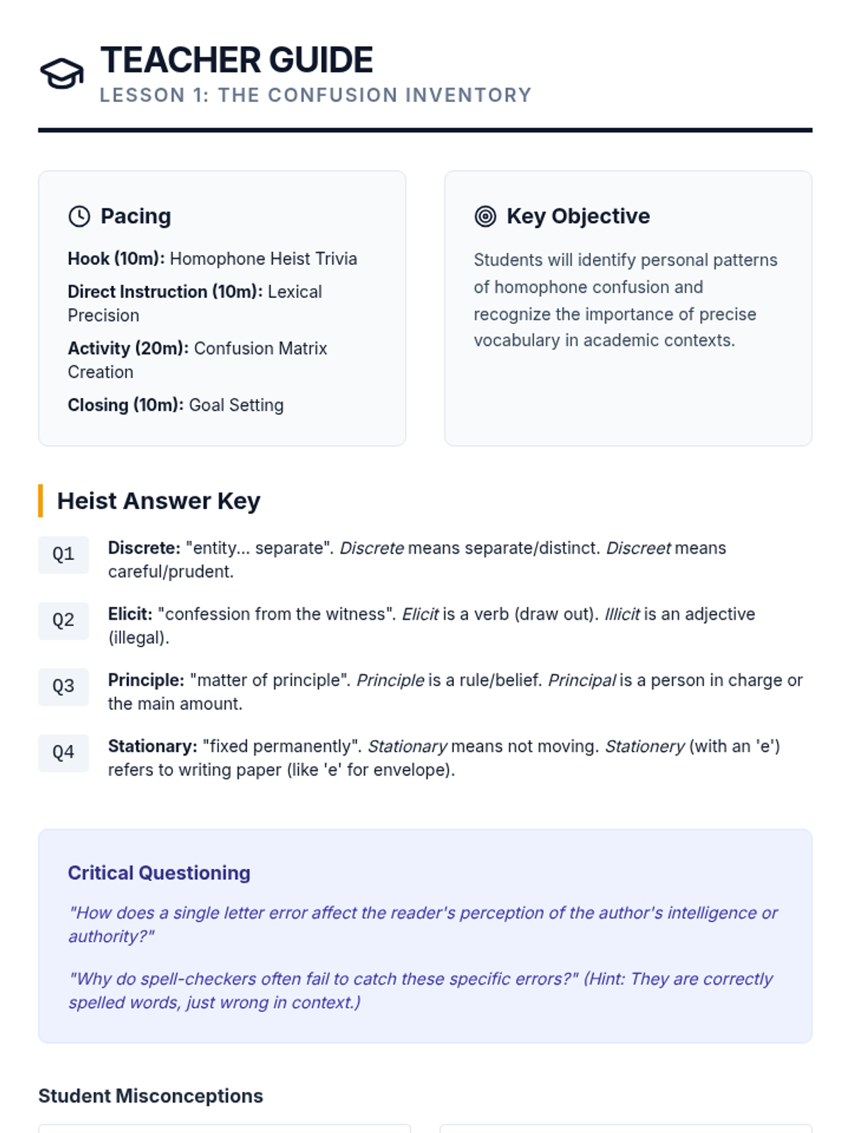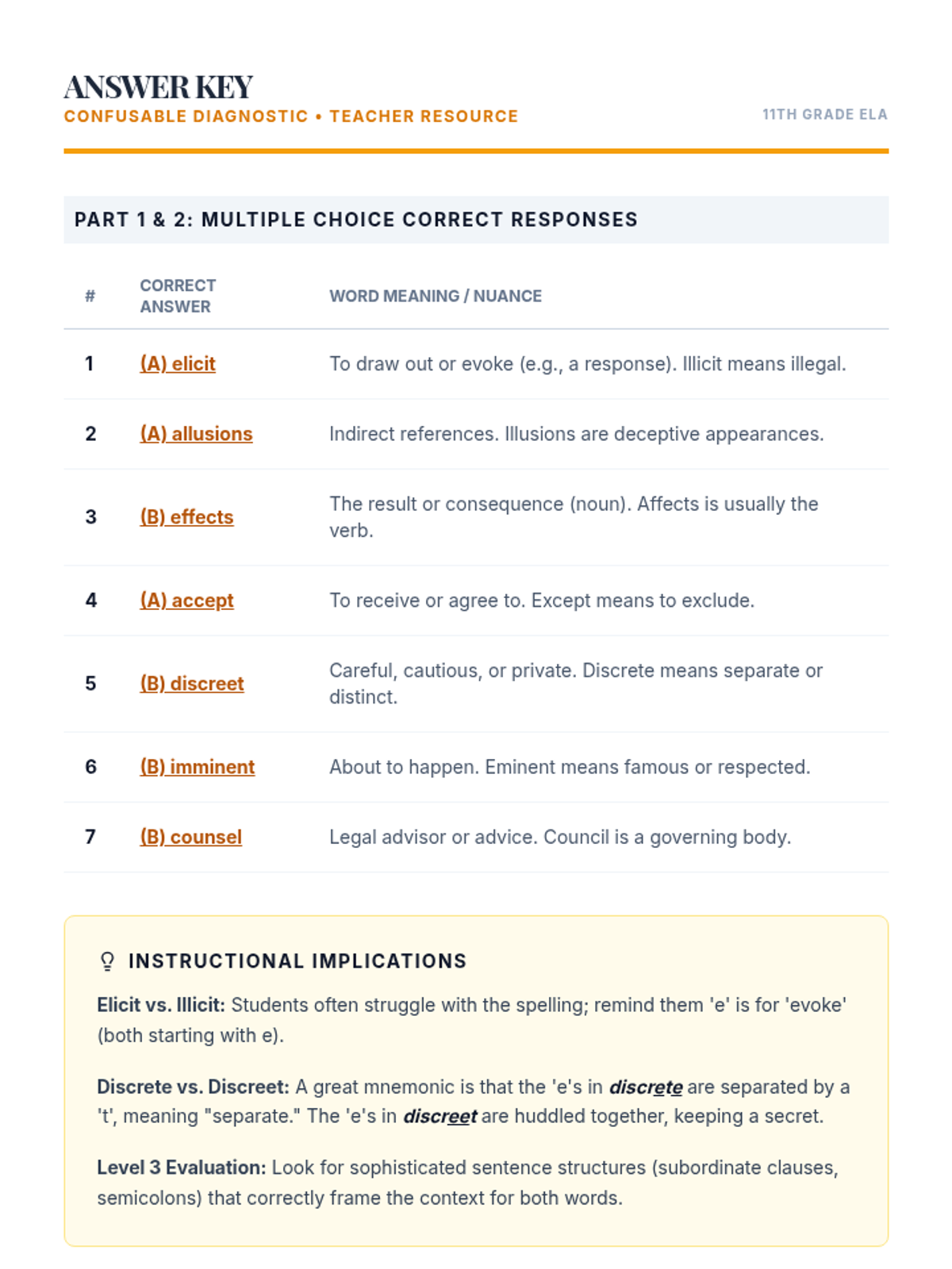 A rigorous sequence for 11th-grade students focusing on high-level academic confusables, paronyms, and homophones commonly found in college-level writing and standardized tests. Students move from diagnostic assessment to deep usage analysis and competitive mastery.