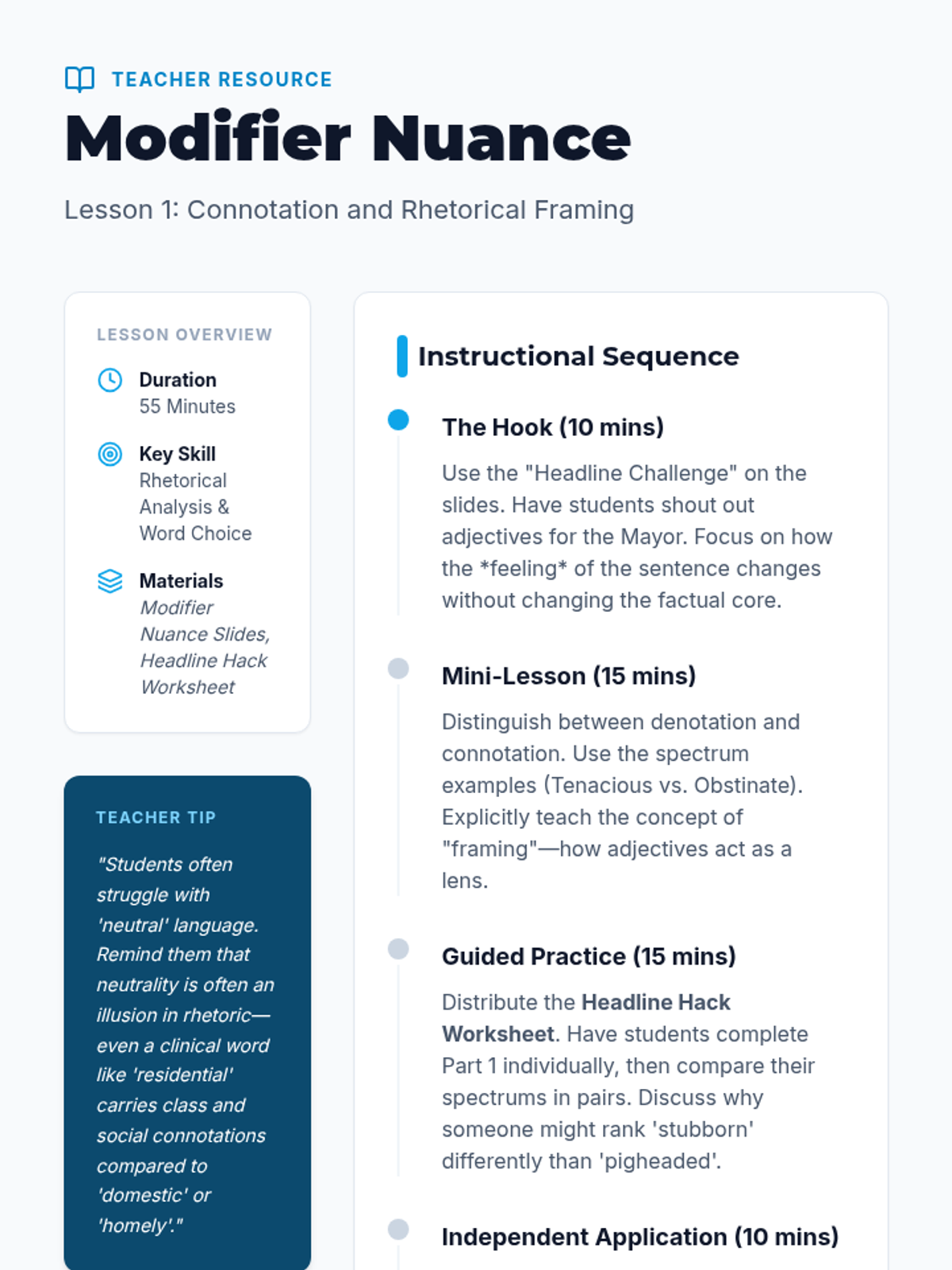 A sequence for 11th Grade students focusing on the rhetorical impact of adjectives in argumentative and non-fiction writing. Students learn to analyze connotation, identify bias in media, master hyphenation for clarity, and prune redundant modifiers to strengthen their own prose.