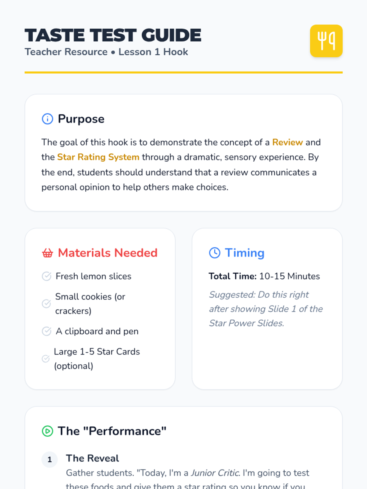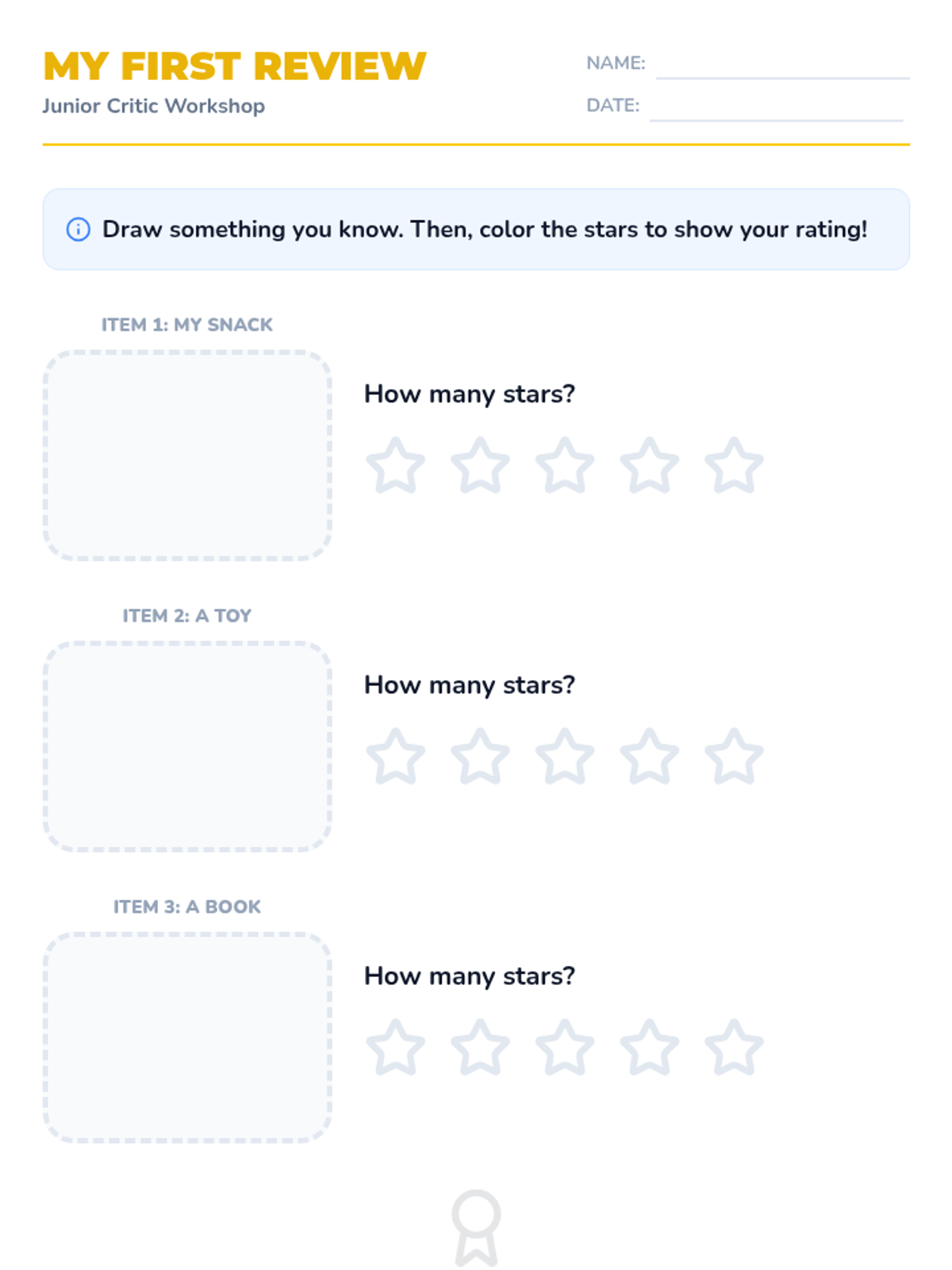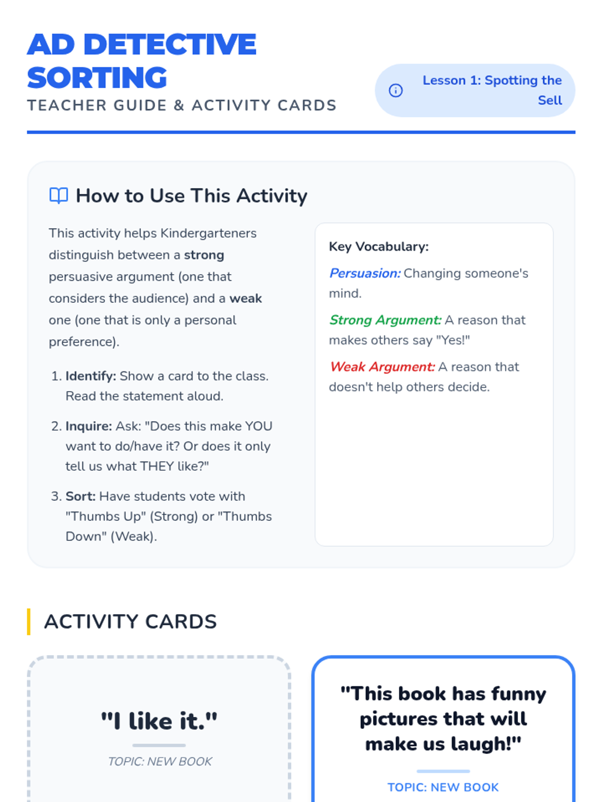 Students learn the art of persuasion by becoming 'Junior Critics.' This sequence guides Kindergarteners through the process of writing reviews for books, toys, and foods, using star ratings, descriptive adjectives, and target audience recommendations to influence their peers.