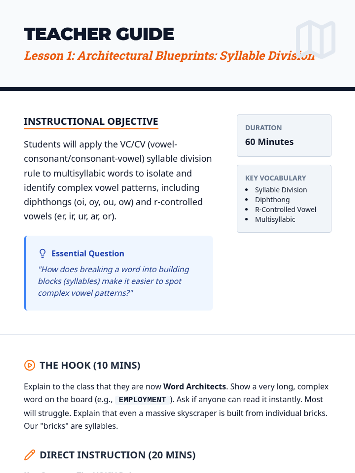 A 4th-grade ELA sequence where students act as 'Word Architects' to master multisyllabic words containing diphthongs, r-controlled vowels, and variant patterns. Students learn to divide syllables and use morphological clues to decode complex vocabulary.