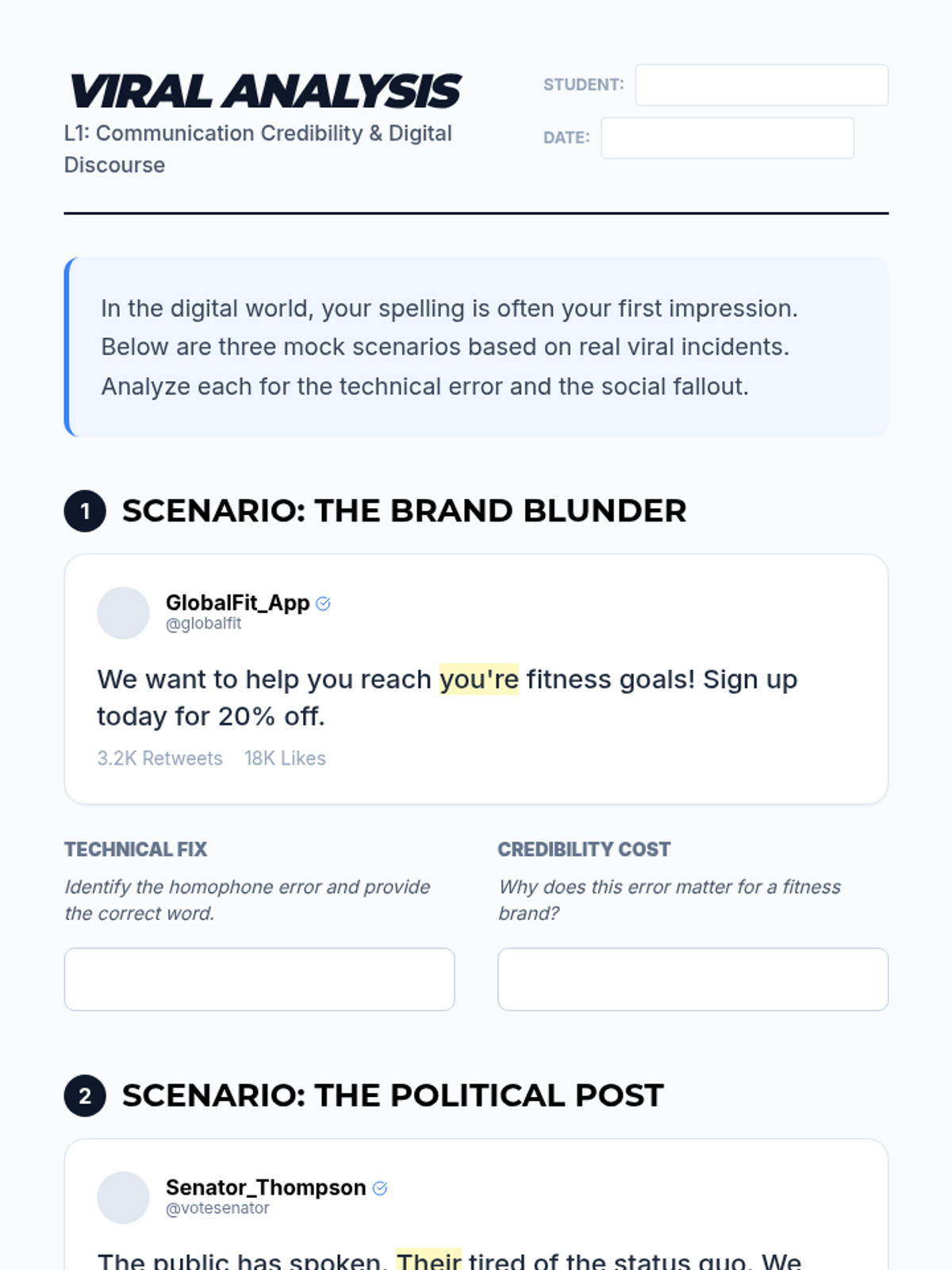 A 12th-grade sequence exploring the social, psychological, and linguistic implications of homophone errors in the digital age, focusing on credibility and the evolution of language.