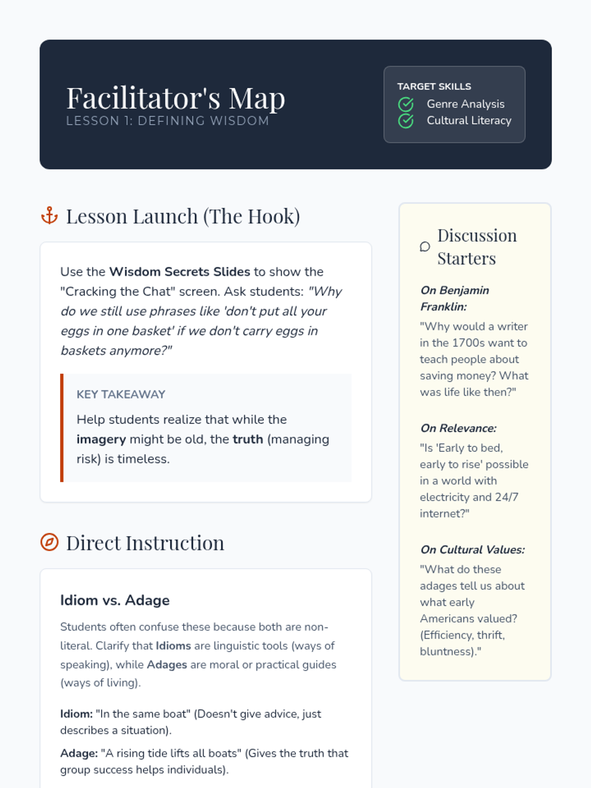 An 8th-grade ELA unit exploring idioms, adages, and proverbs through a global lens. Students compare American sayings with international wisdom to identify universal themes and the influence of culture on language.