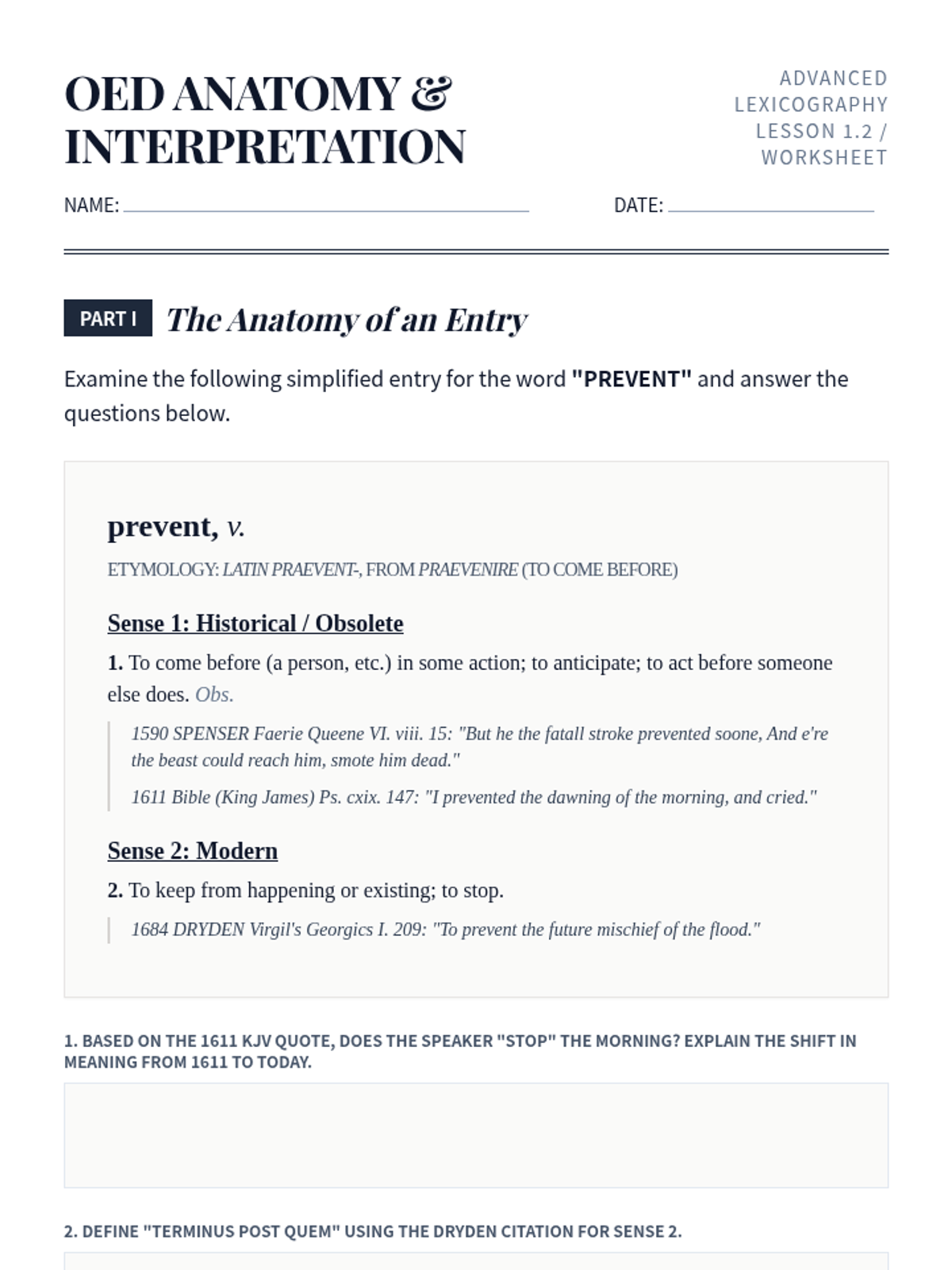 This undergraduate-level sequence explores the academic field of lexicography, focusing on historical dictionary principles, etymological tracing of Indo-European roots, and the tension between descriptive and prescriptive linguistics. Students develop proficiency in using the OED and specialized disciplinary glossaries to produce a comprehensive 'word biography' as a final project.