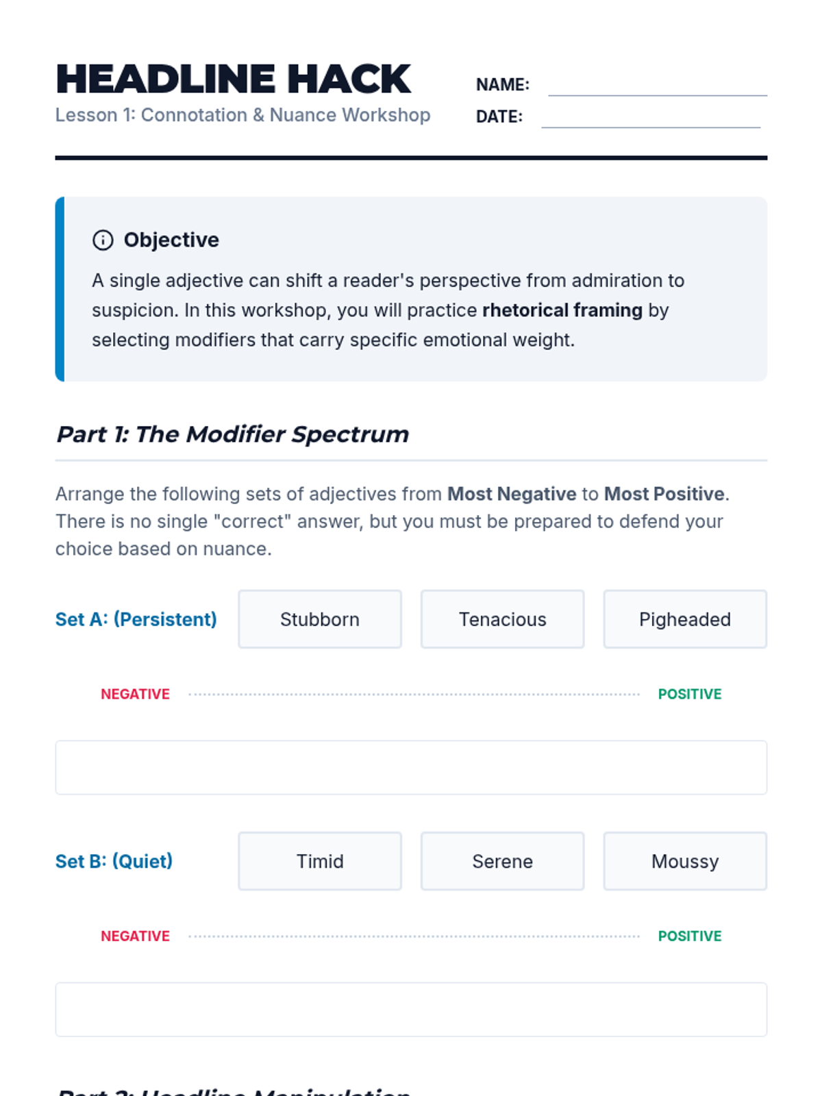 A 9th-grade grammar and rhetoric unit focused on how adjectives and adverbs influence bias, connotation, and persuasion in media and non-fiction. Students move from understanding word nuance to analyzing news and advertising, culminating in writing a persuasive editorial.