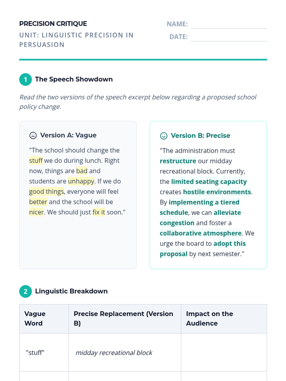 A project-based sequence for 8th-grade students focusing on the power of linguistic precision in persuasive writing and speaking. Students move from critiquing vague language to mastering advanced vocabulary, transitions, and rhetorical strategies to build compelling arguments.