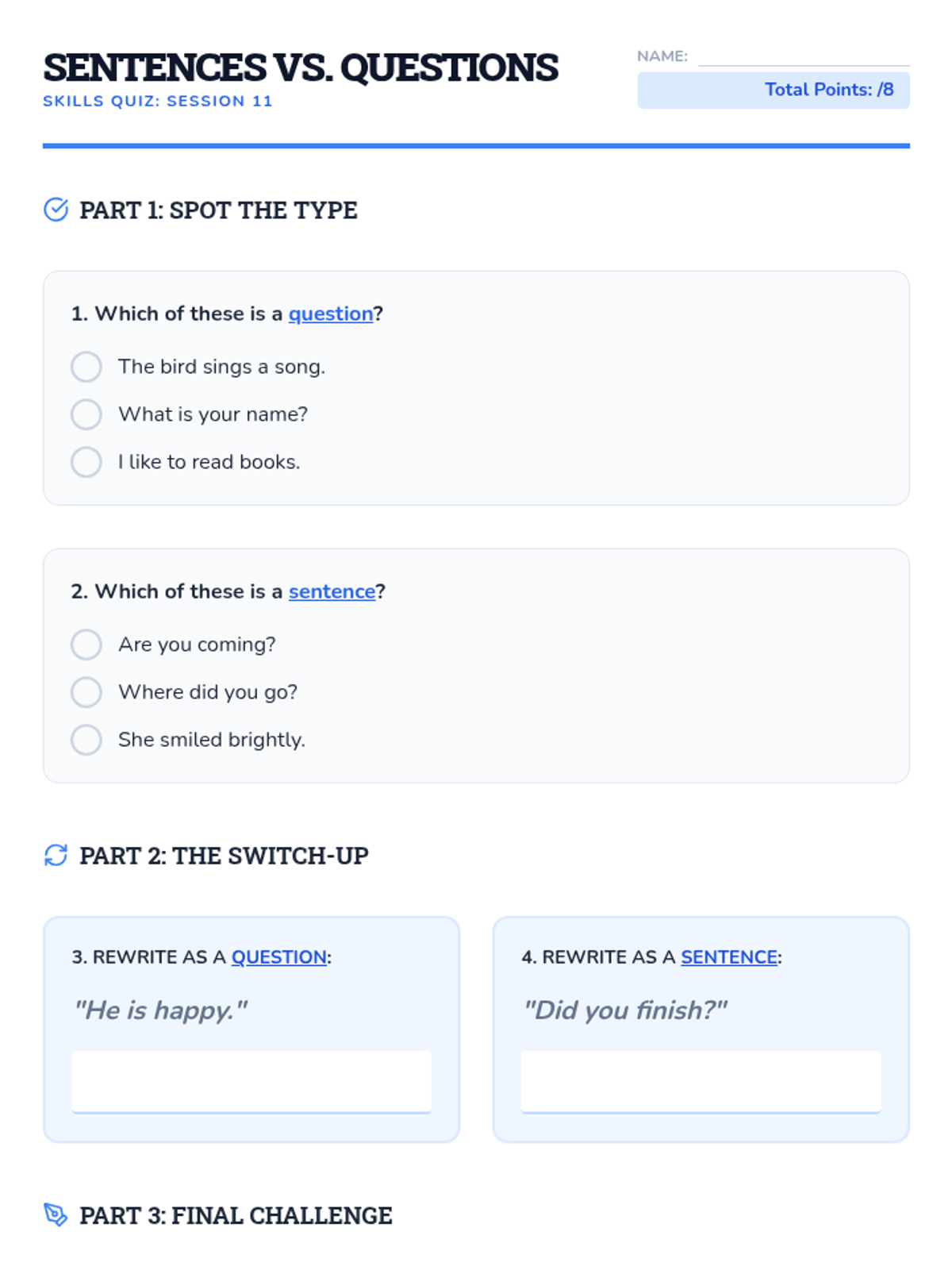 A comprehensive introduction to the six primary question words (who, what, where, when, why, and how) for first-grade students. Through a 'Question Detective' theme, students learn to categorize information, match interrogatives to specific answer types, and conduct peer interviews to gather details.