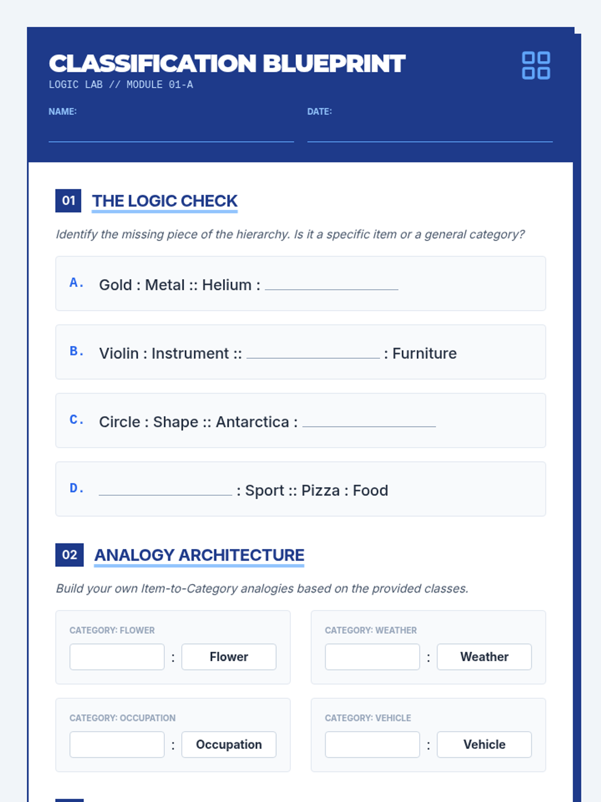 A rigorous exploration of verbal analogies for 12th-grade students, focusing on the logical relationships between words, the precision of bridge sentences, and the nuances of degree and classification. This sequence prepares students for advanced verbal reasoning and standardized testing.