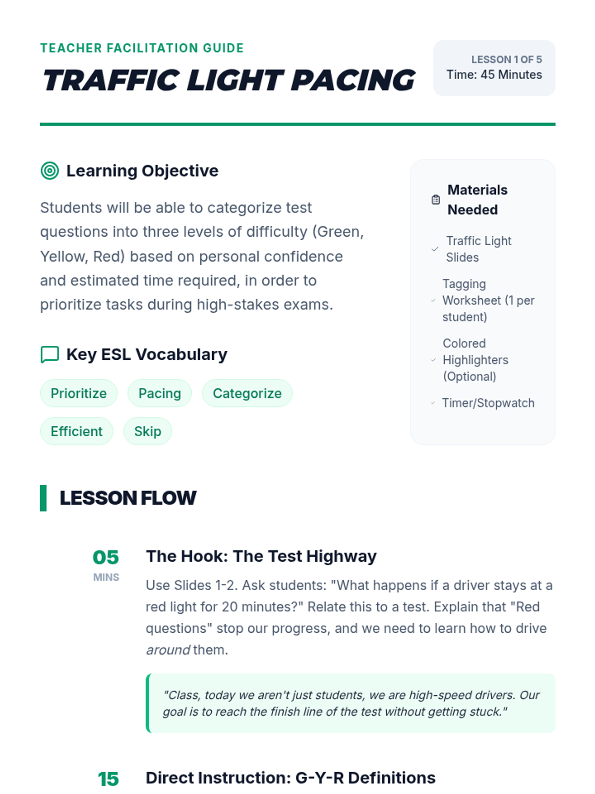 This sequence helps 4th Grade ESL students master test-taking strategies focusing on time management and anxiety regulation. Students learn the 'traffic light' method for prioritization, the 'skip and return' technique for pacing, mindfulness strategies for stress, and mechanics for accurate bubbling.