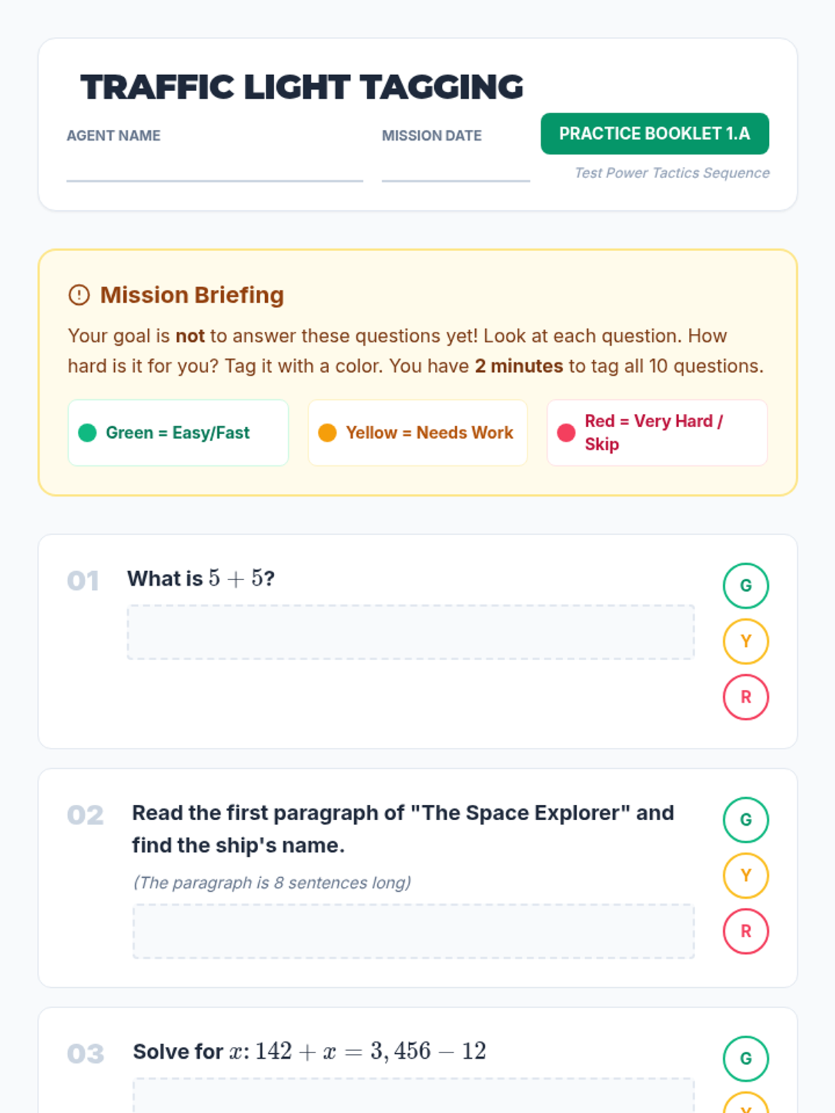This sequence addresses the psychological and logistical challenges of timed exams through simulation and strategy, treating test-taking as a resource management game where time is the currency. Students learn to benchmark their pacing, apply triage strategies for difficult questions, manage anxiety, and utilize intelligent guessing to maximize their score potential.