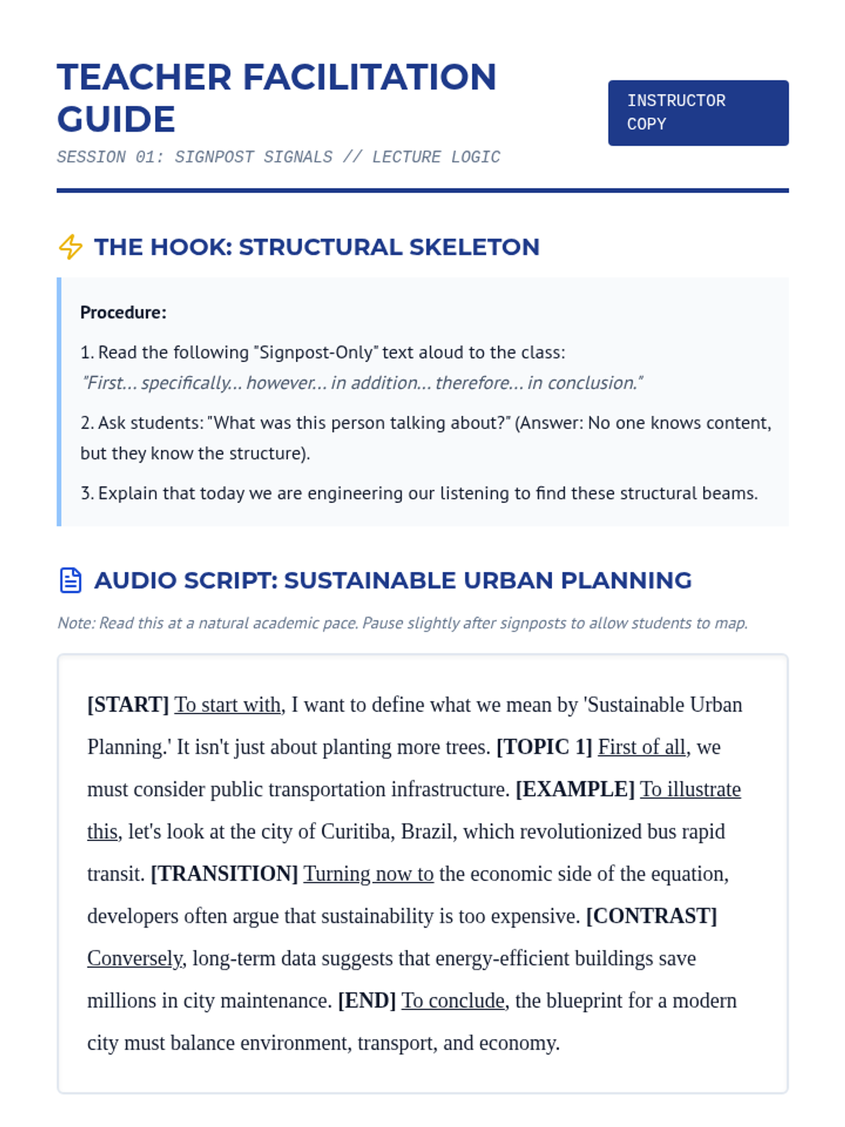 This sequence prepares intermediate ESL students for university-level academic listening by focusing on signposting language, speaker stance, hedging, and strategic note-taking. Students will move from identifying basic transitions to synthesizing complex arguments from multiple spoken sources.