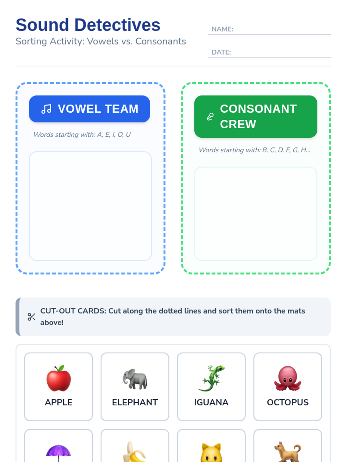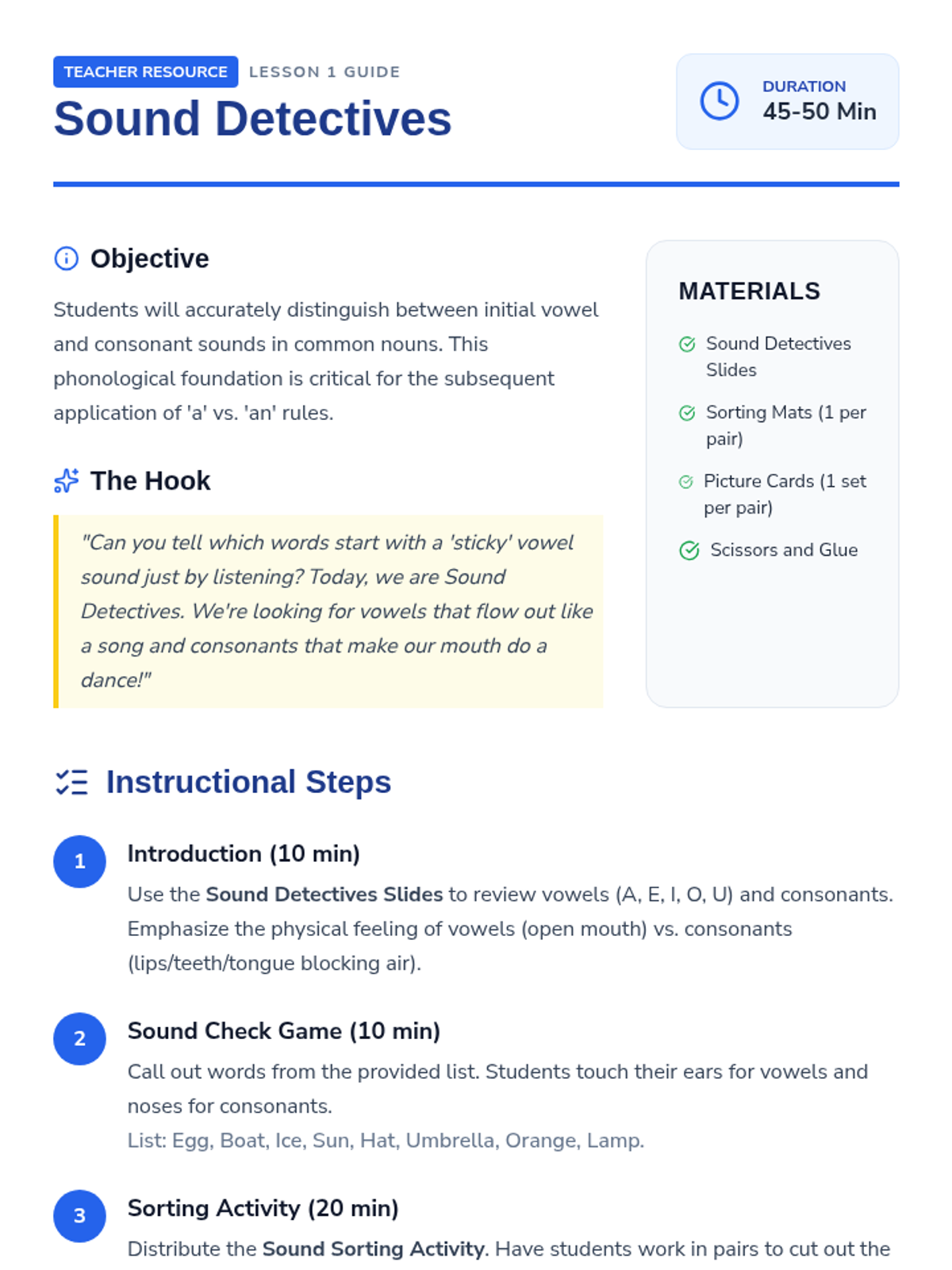 A comprehensive 2nd Grade sequence focusing on the phonetic rules of indefinite articles 'a' and 'an'. Students progress from phonemic awareness of initial sounds to applying article rules in complex sentences with adjectives.