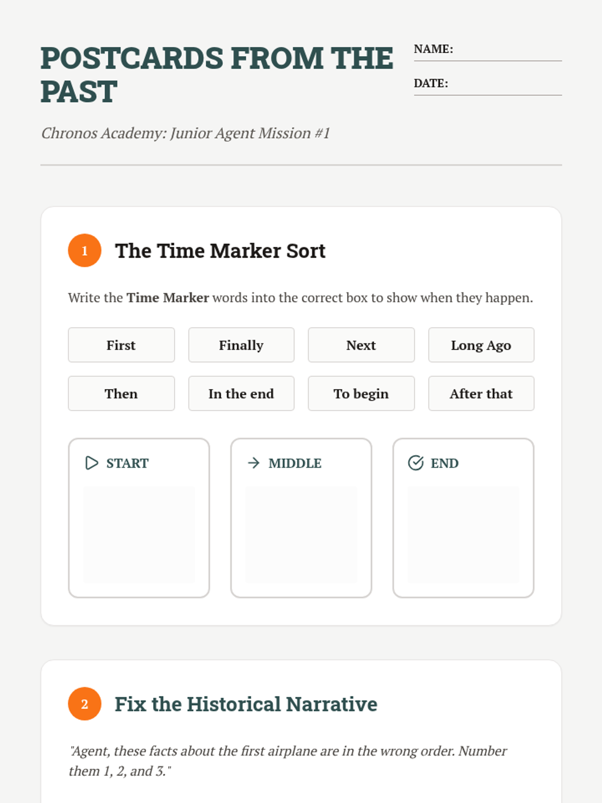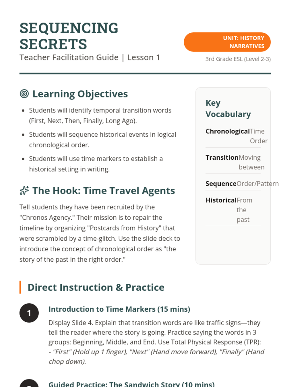 This sequence helps 3rd-grade ESL students master chronological language through social studies content. Students will learn to use transition words, past tense verbs, and biographical structures to tell stories of the past.