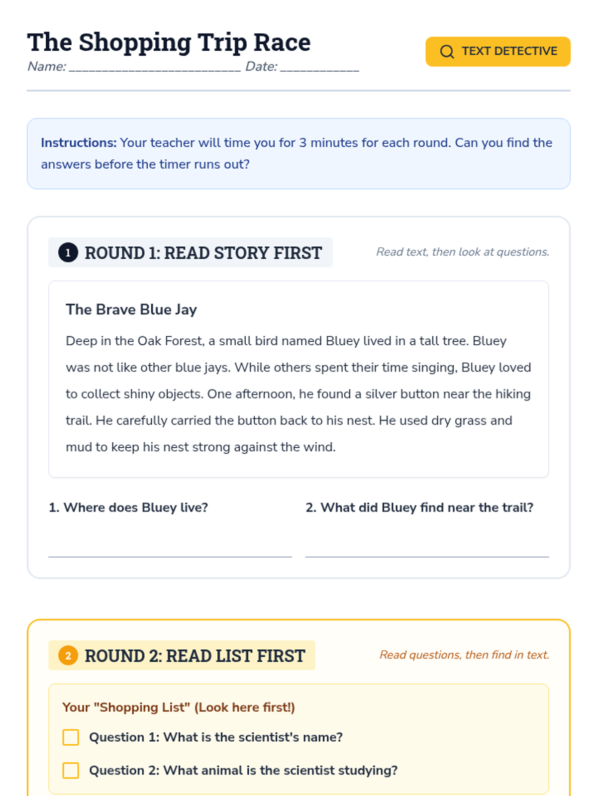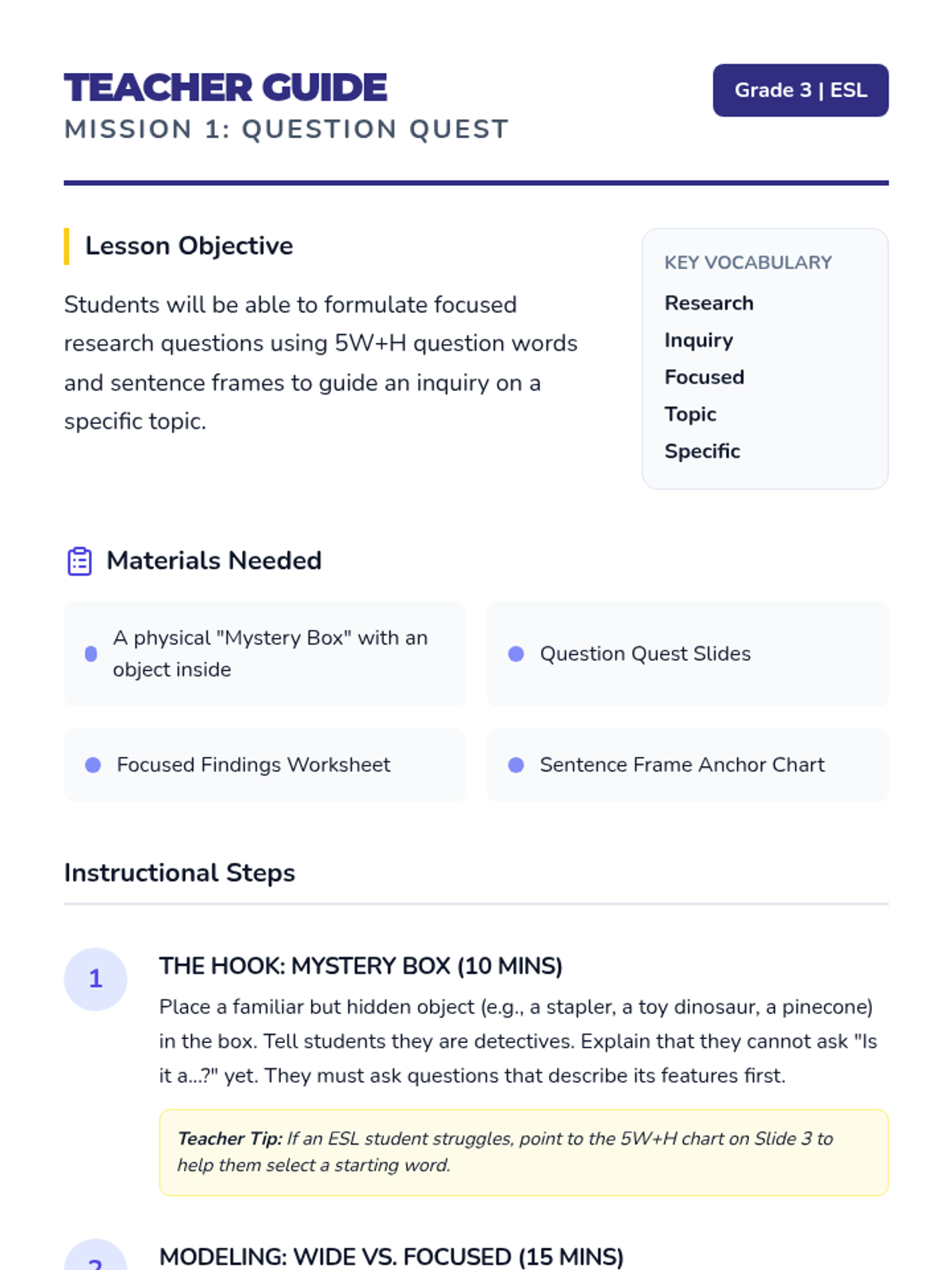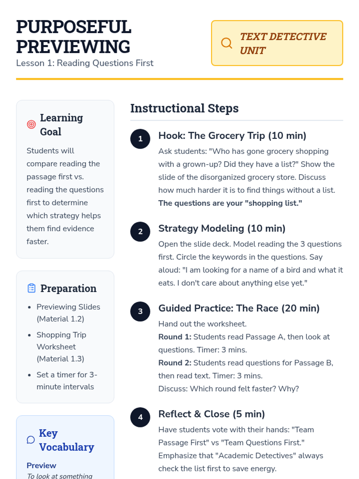 A comprehensive sequence for 3rd grade ESL students to master skimming and scanning techniques for academic success. Through a detective-themed curriculum, students learn to identify text features, isolate keywords in questions, and rapidly locate specific data to improve test-taking efficiency.