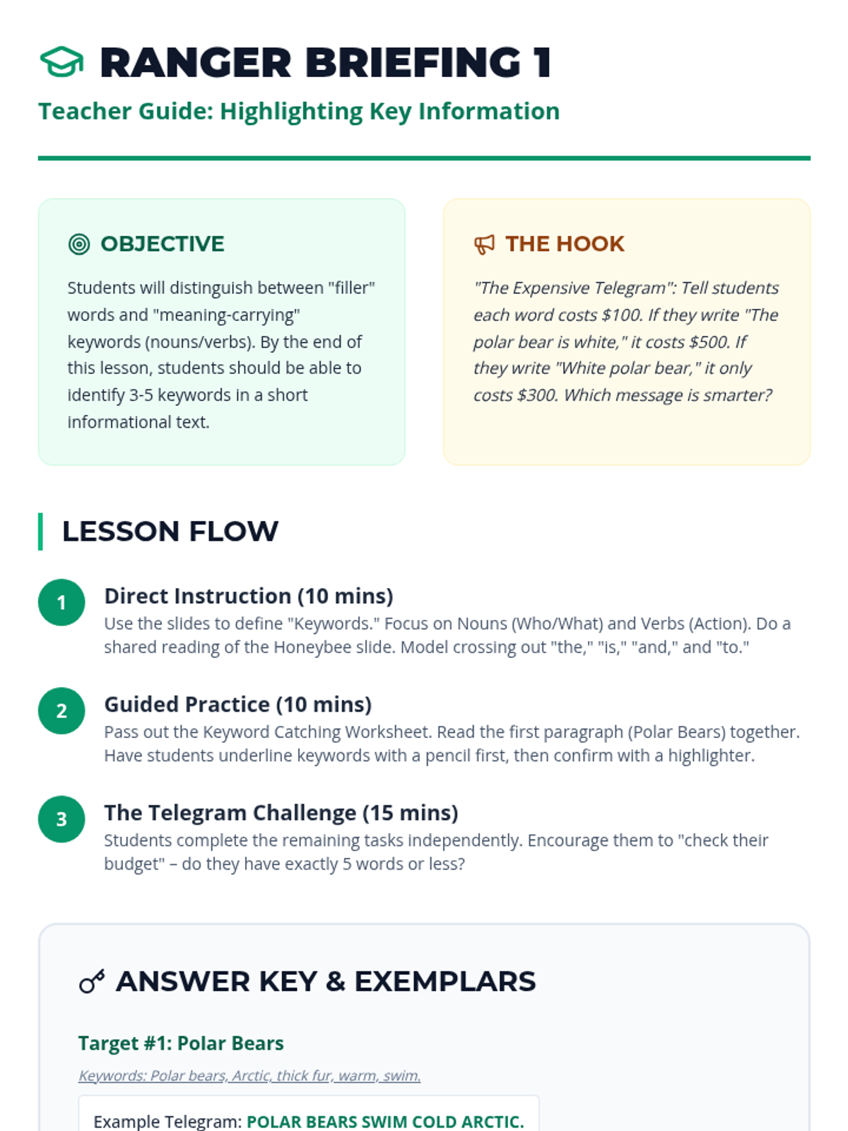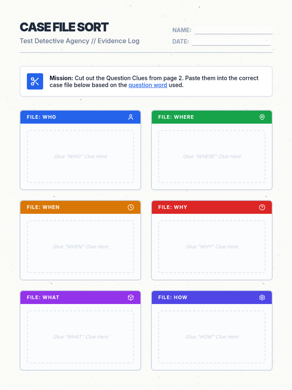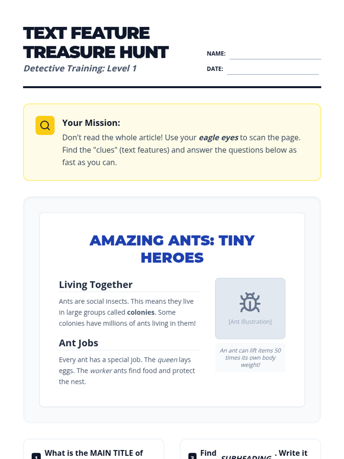 A comprehensive sequence for 3rd grade ESL students to master skimming and scanning techniques for academic success. Through a detective-themed curriculum, students learn to identify text features, isolate keywords in questions, and rapidly locate specific data to improve test-taking efficiency.