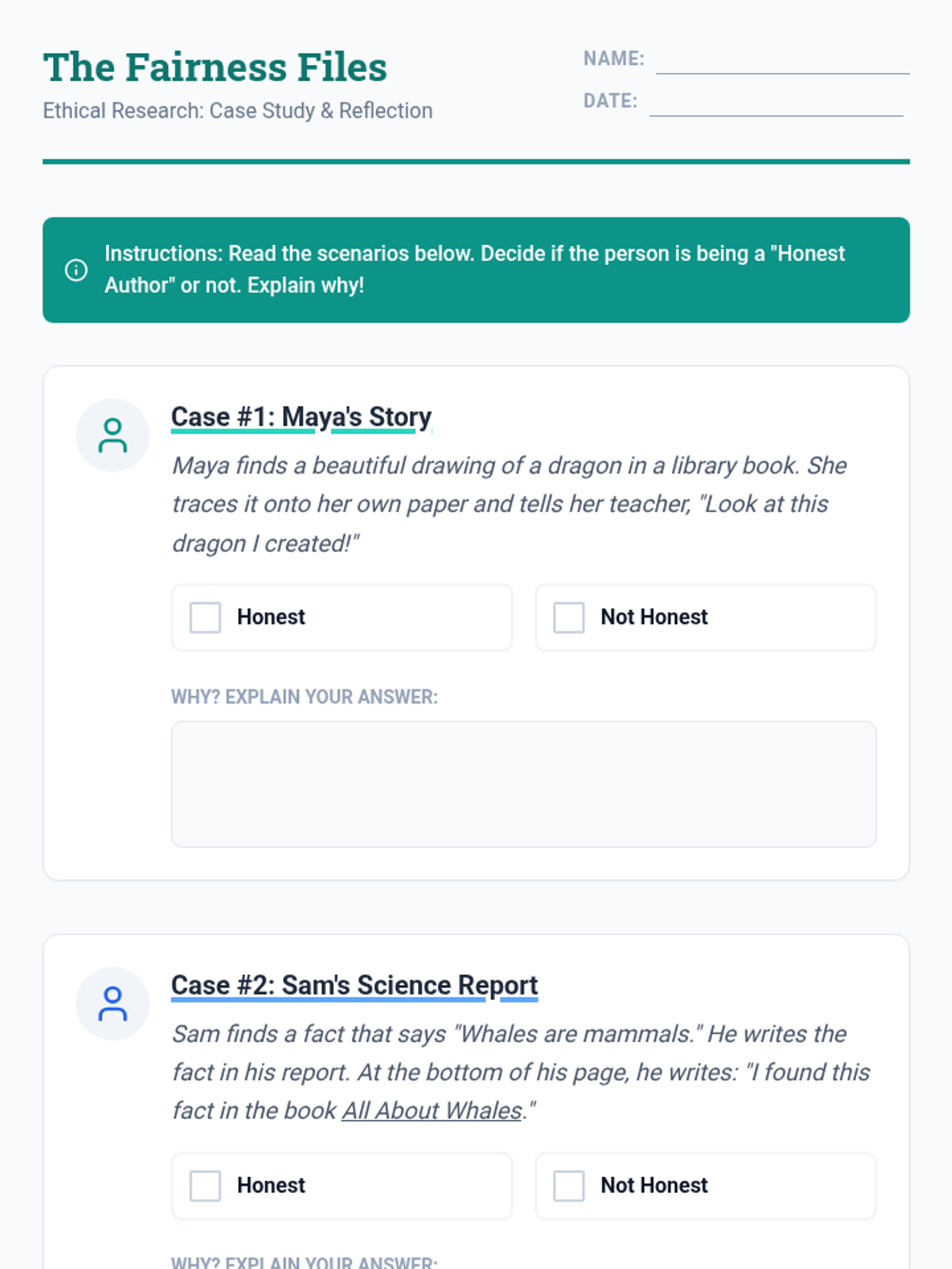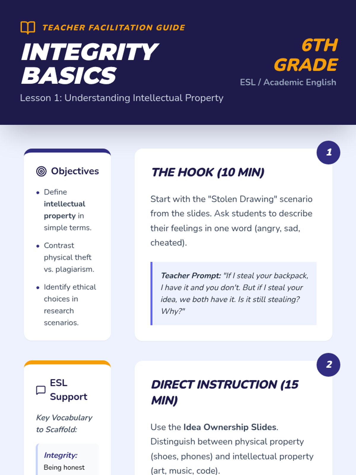 A comprehensive 4th-grade ESL project-based sequence on academic integrity and citation standards. Students transition from understanding the ethics of intellectual property to mastering the technical skills of citing books and websites, culminating in a mini-research project.