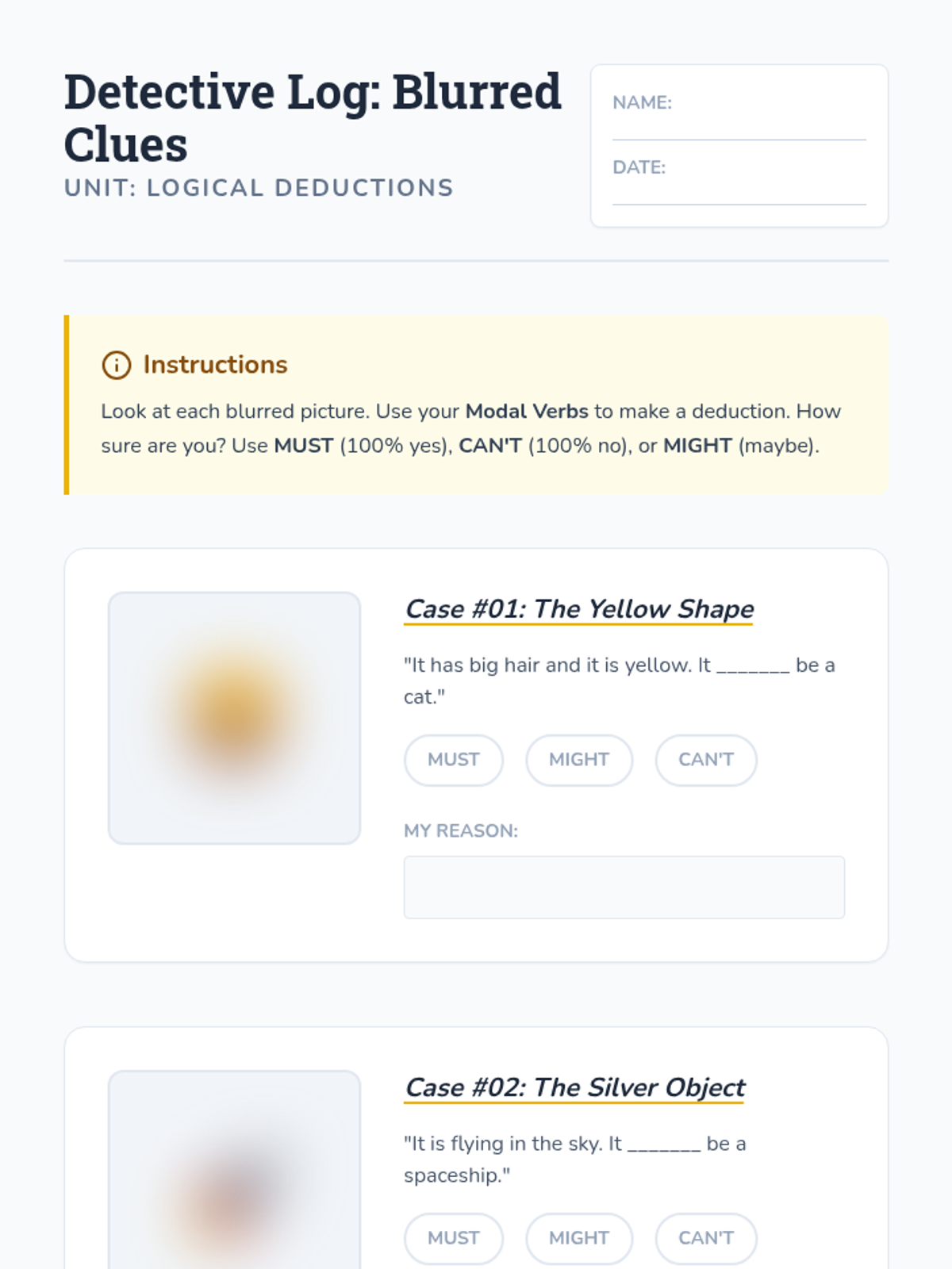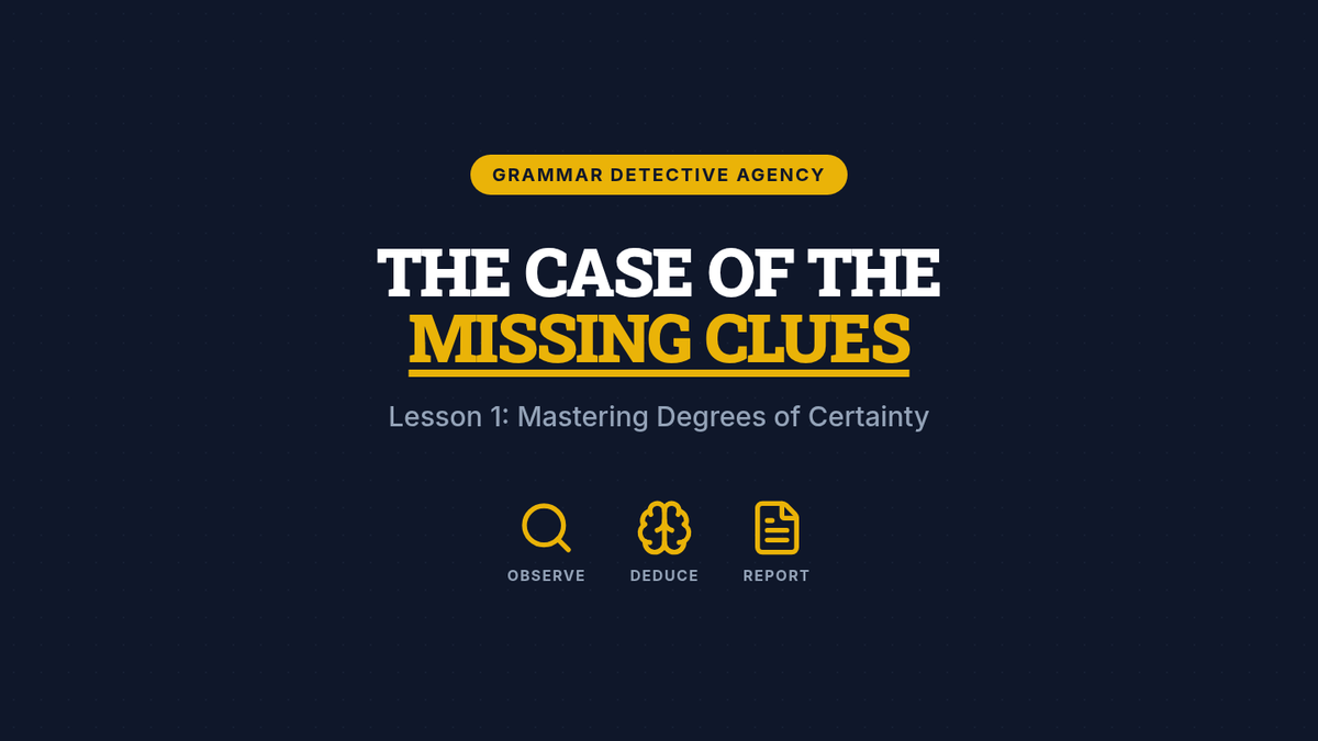 A 5-lesson ESL sequence for 3rd graders to master modal verbs of deduction (must, might, can't) through a fun detective-themed inquiry process. Students move from understanding degrees of certainty to solving a full-scale classroom mystery using logical reasoning.