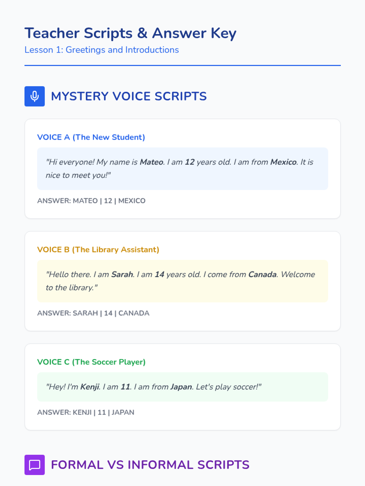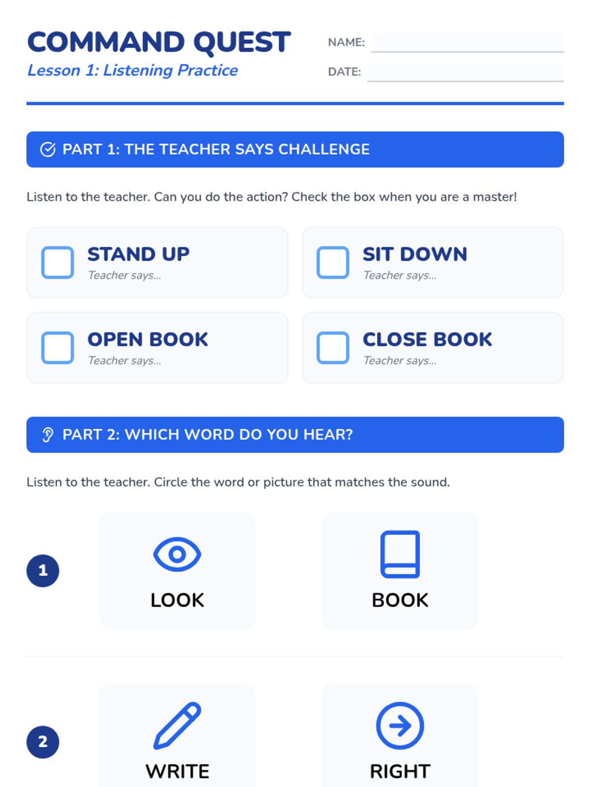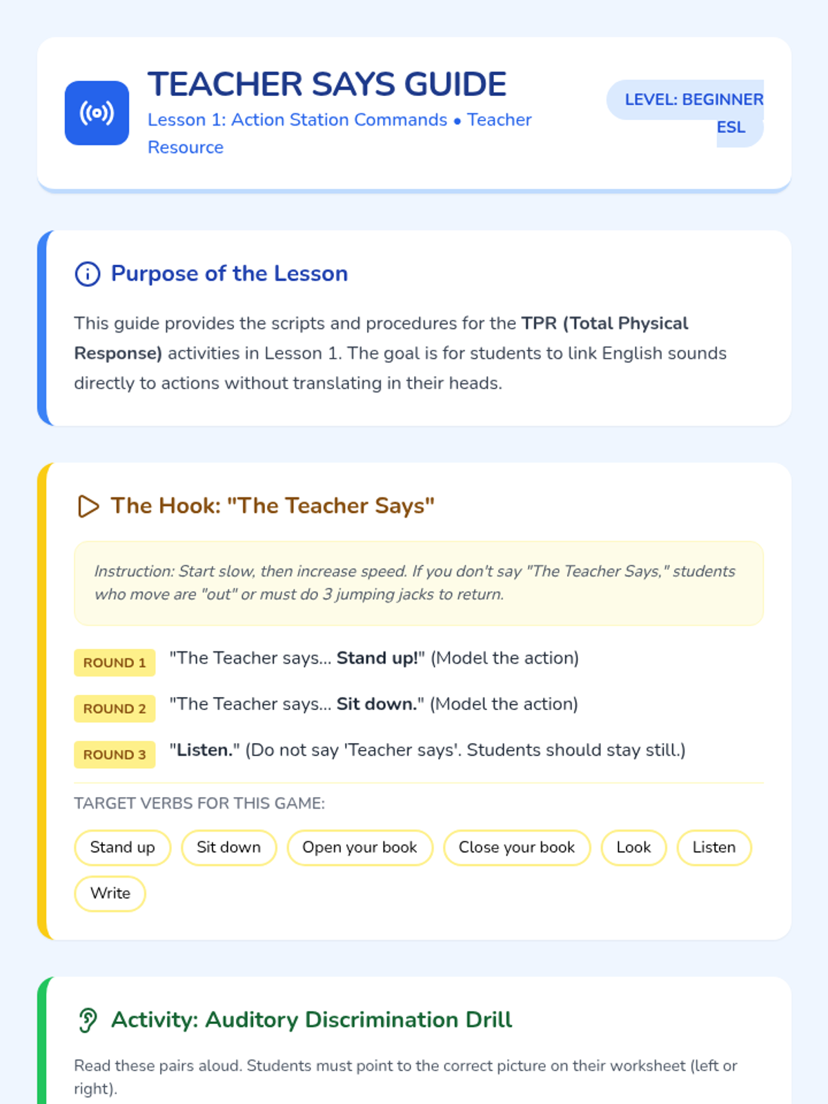 A comprehensive listening sequence for beginner ESL students to navigate their middle school environment. Students progress from basic classroom commands and object identification to mastering numbers, times, and social introductions through active listening simulations.