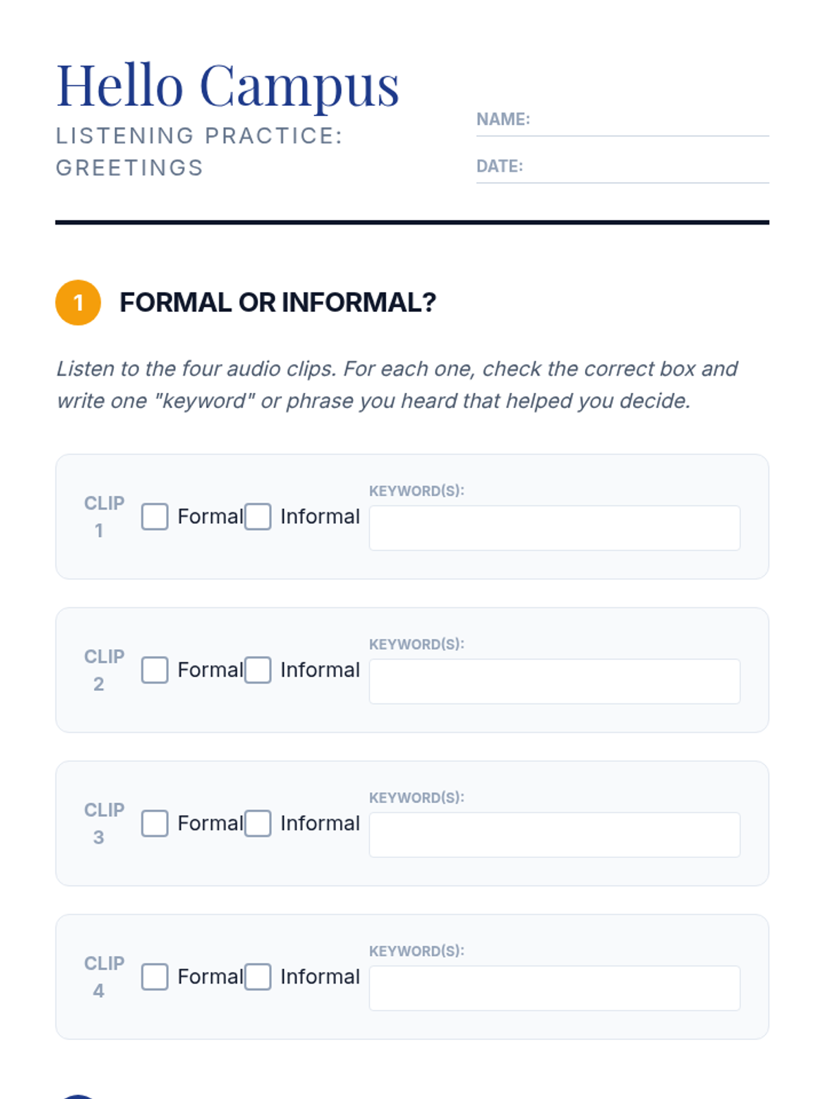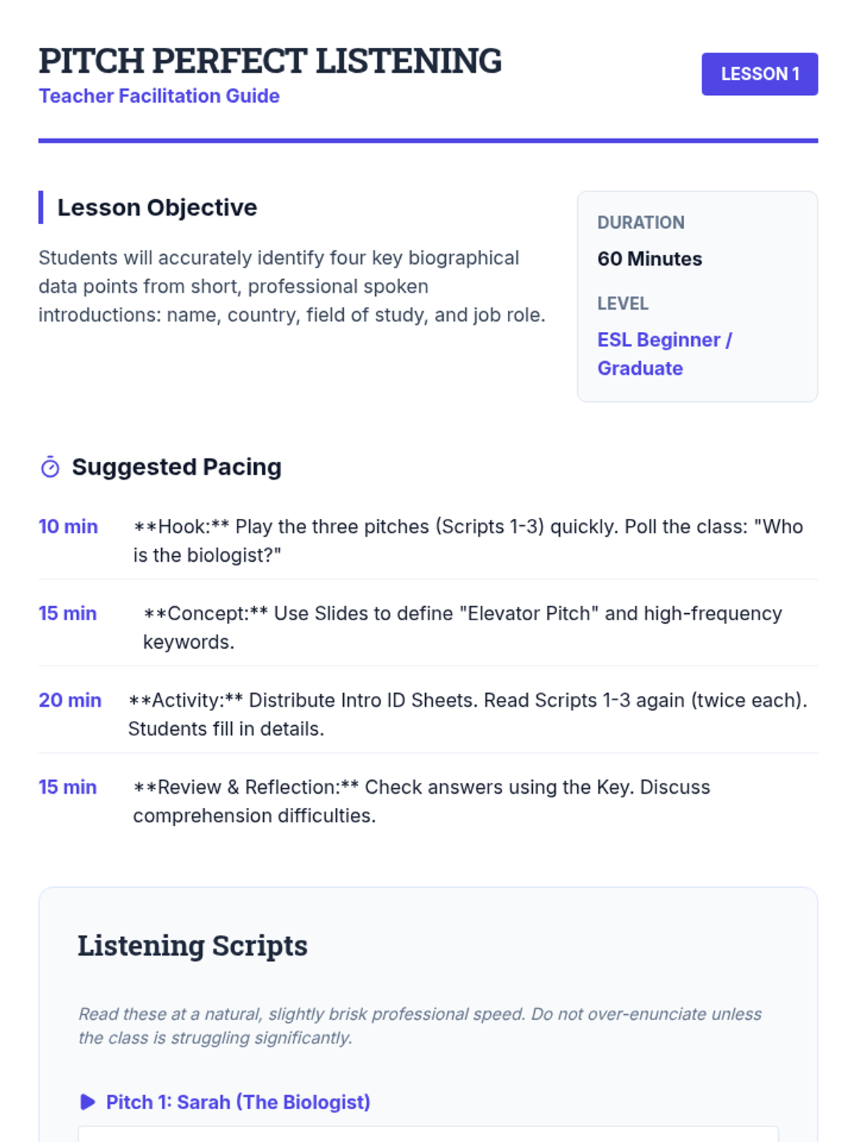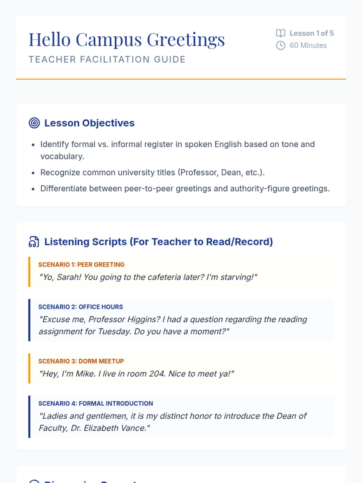 A comprehensive ESL listening sequence designed to help beginner undergraduate students navigate university life through auditory recognition of greetings, commands, spatial directions, and schedules. Students will progress from identifying social registers to synthesizing complex campus scenarios.