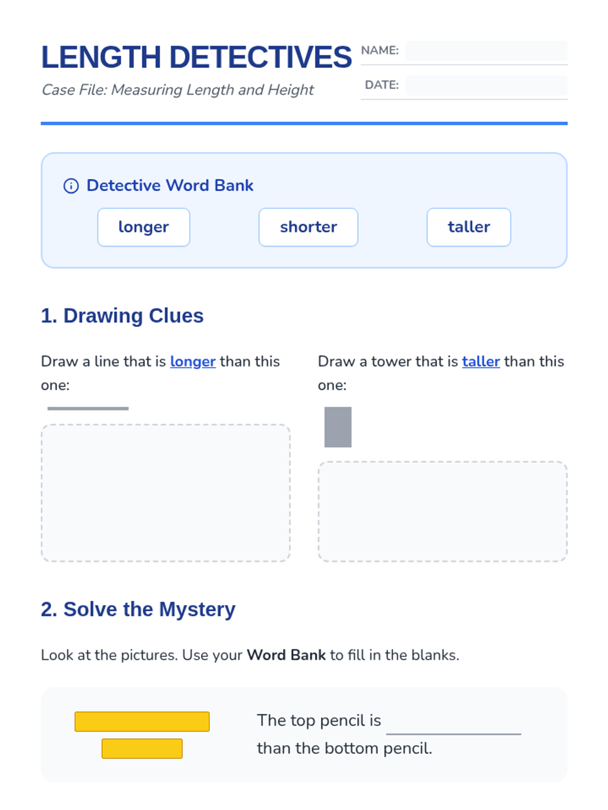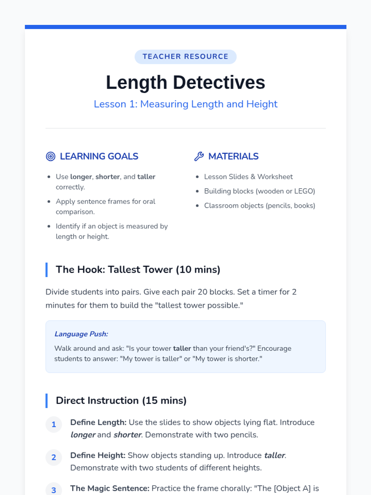 A first-grade ESL sequence focusing on academic language for mathematical comparisons. Students progress from physical attributes like length and weight to abstract concepts of quantity and equality, using structured sentence frames and hands-on activities.