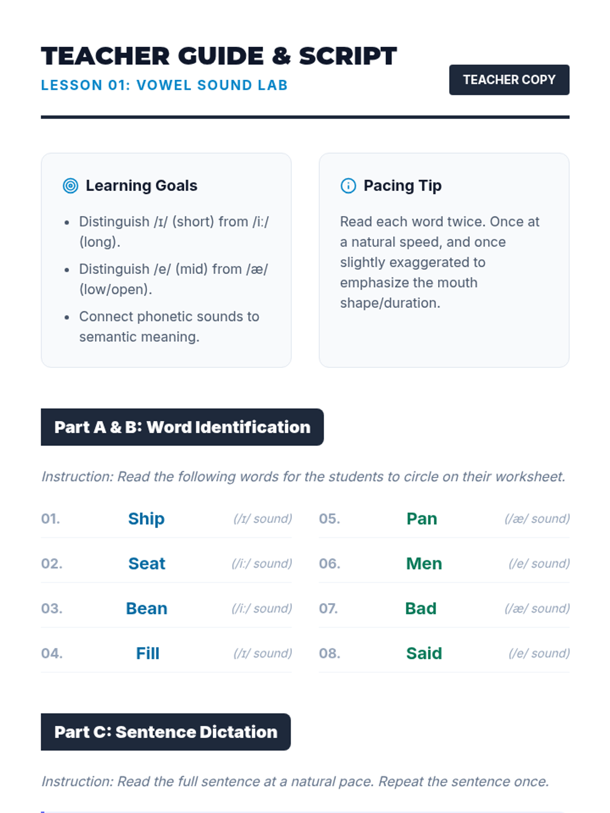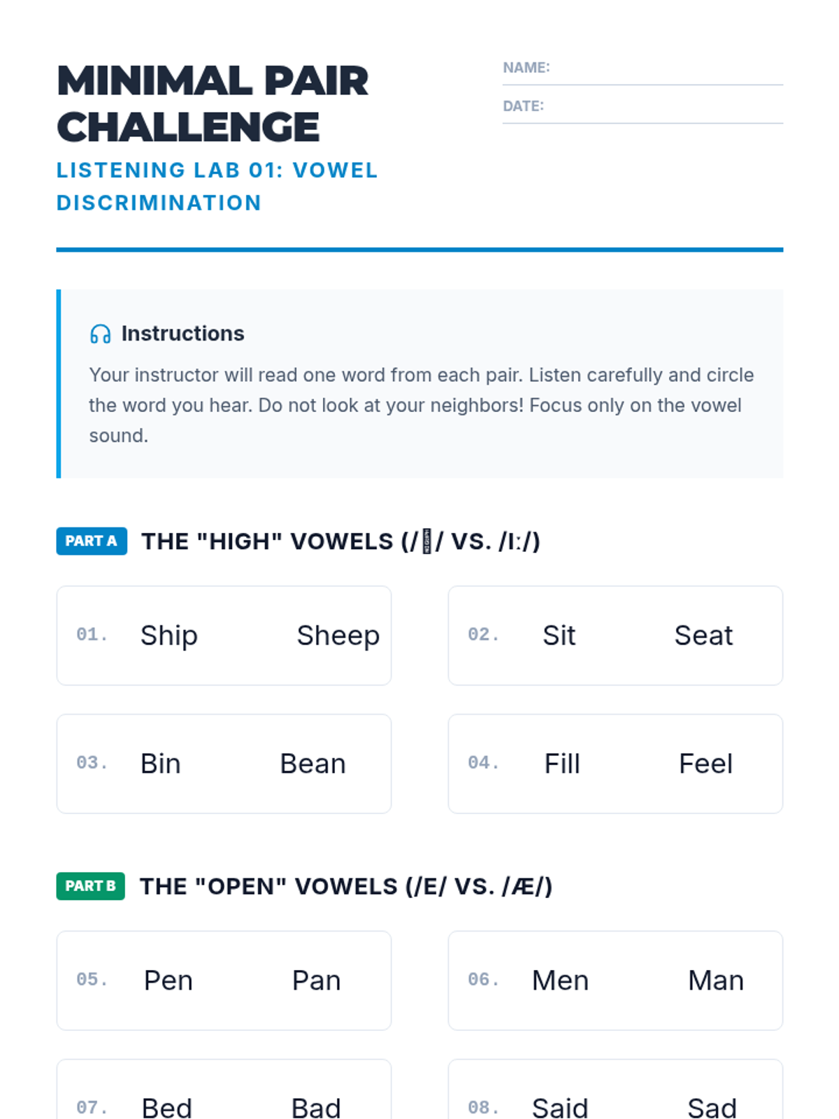 A systematic listening sequence for adult ESL beginners, focusing on high-accuracy phonemic discrimination and numerical data processing in academic and daily contexts.