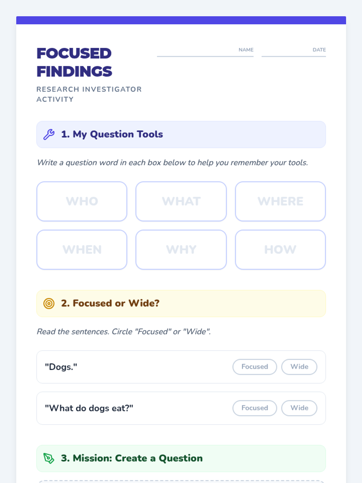 A 5-lesson unit for 3rd grade ESL students on foundational research skills, focusing on formulating questions, using keywords, navigating text features, and evaluating source relevance.