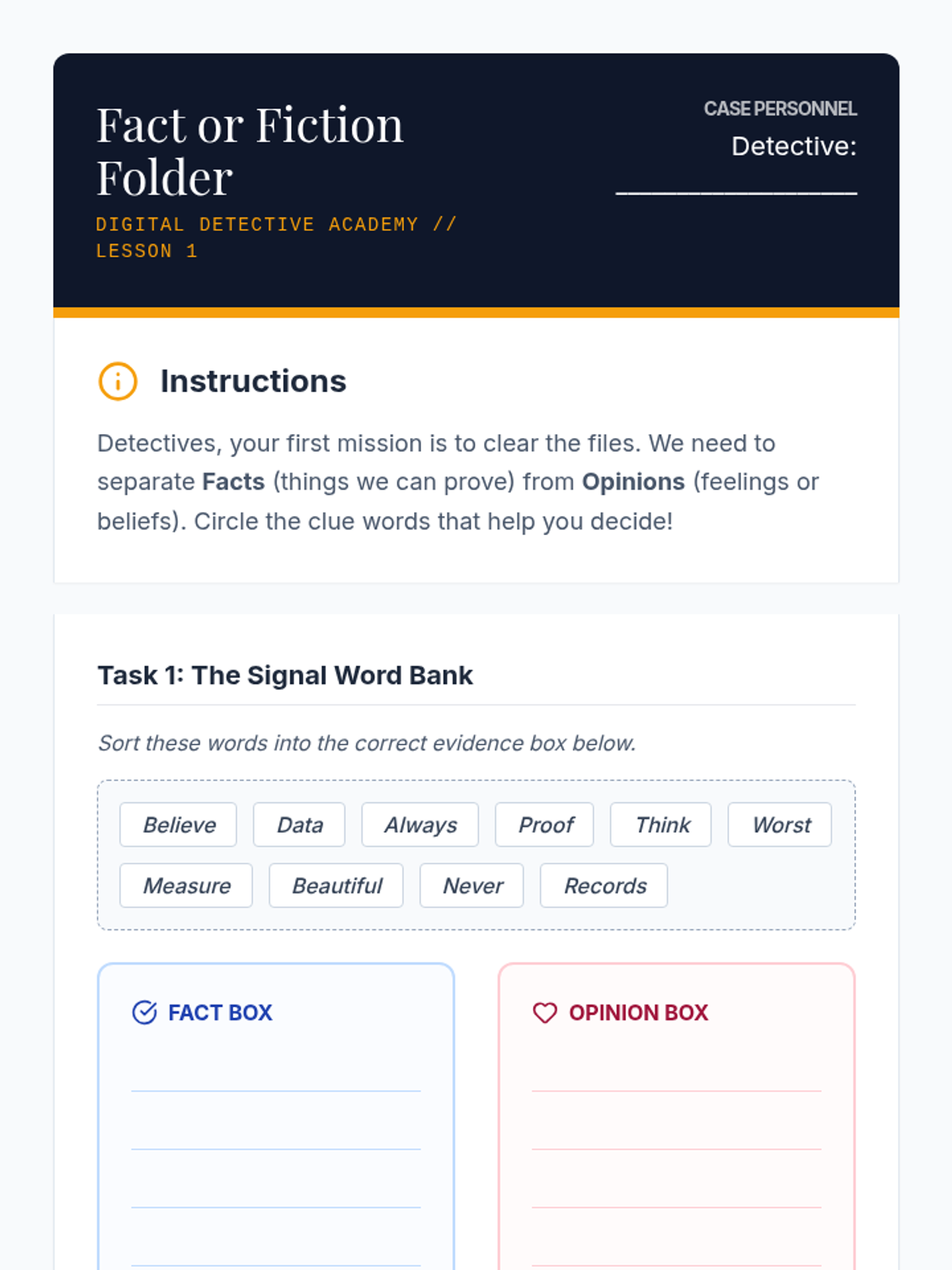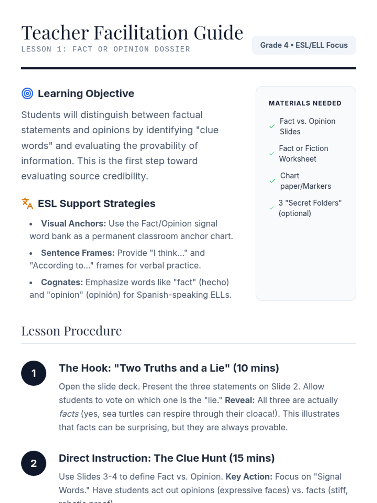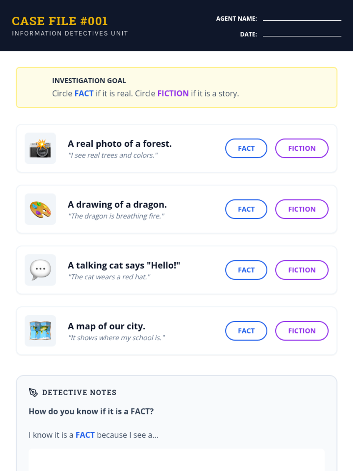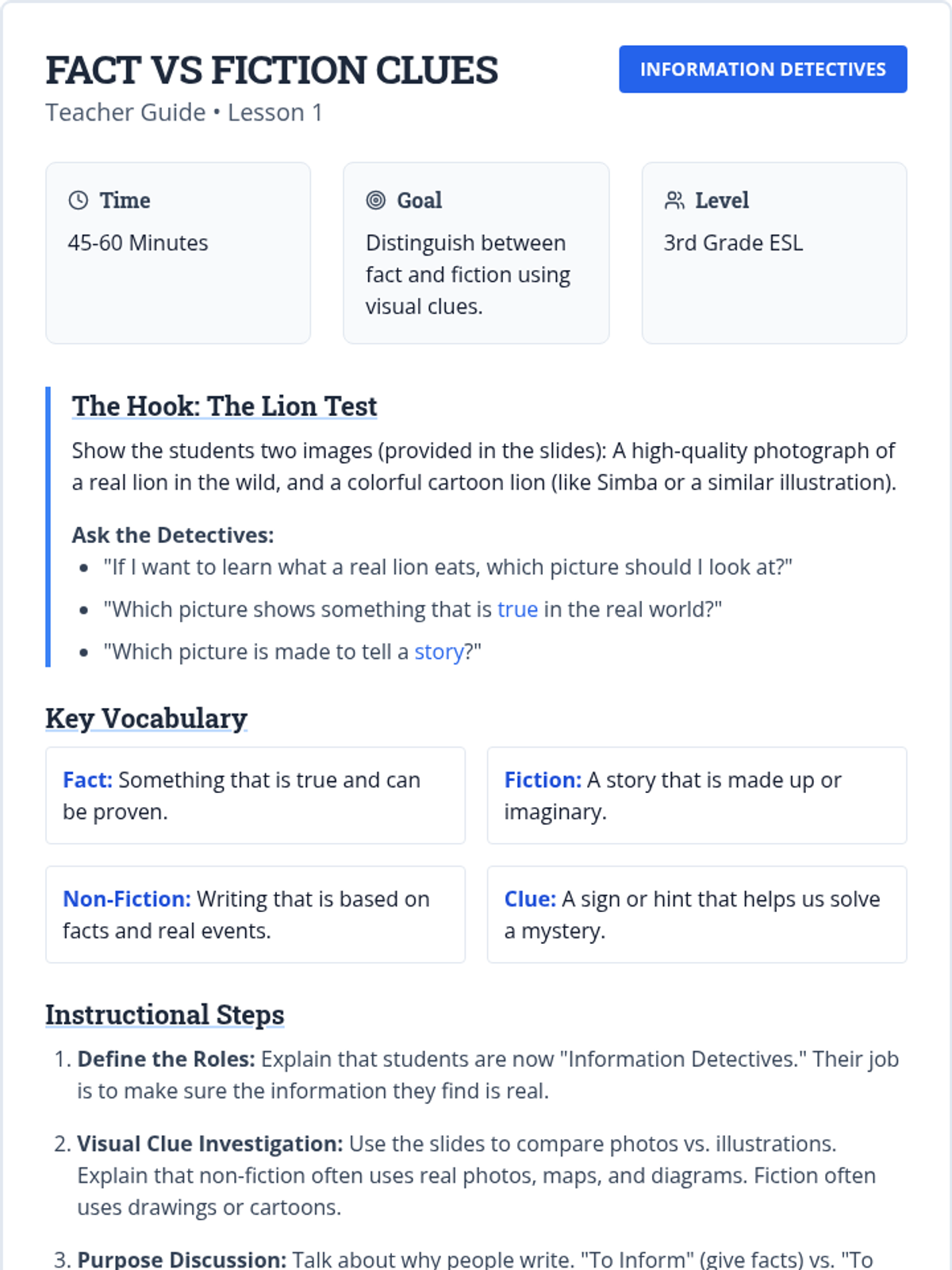 A 5-lesson sequence for 3rd-grade ESL students to learn the basics of source credibility and fact-checking through the lens of 'Information Detectives'. Students learn to distinguish fact from fiction, identify authors, recognize advertisements, and cross-check information.
