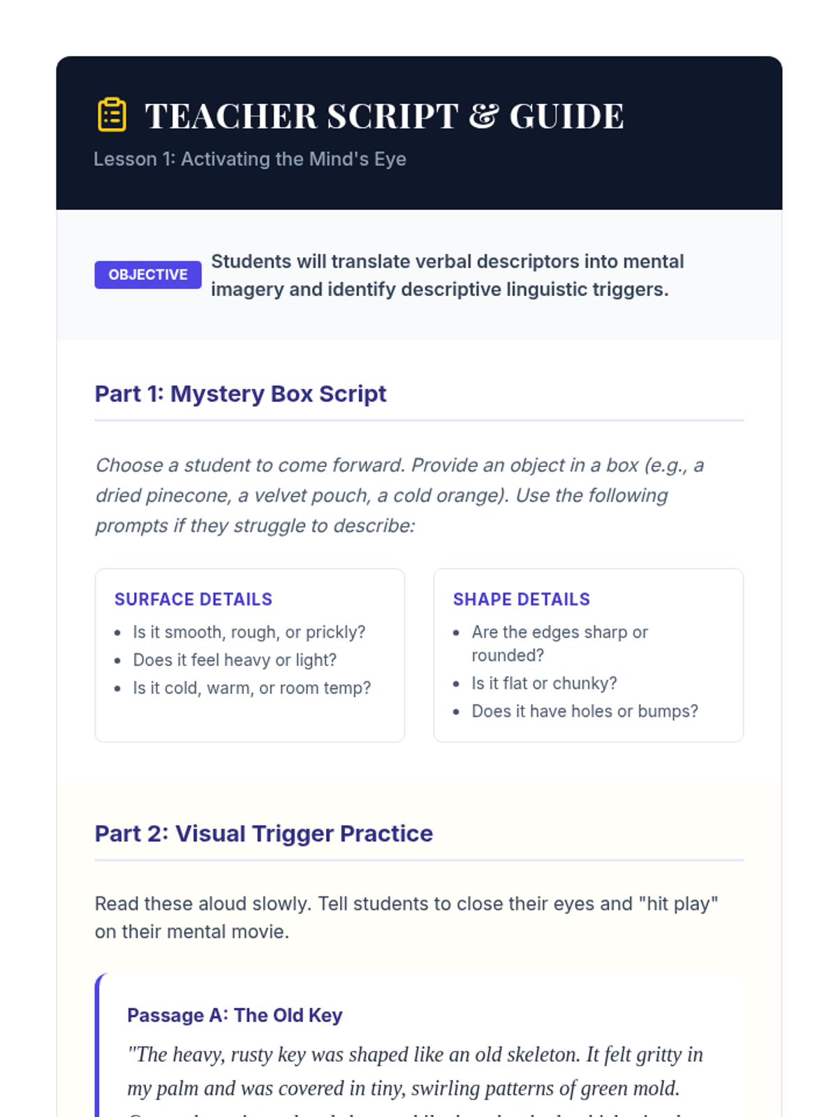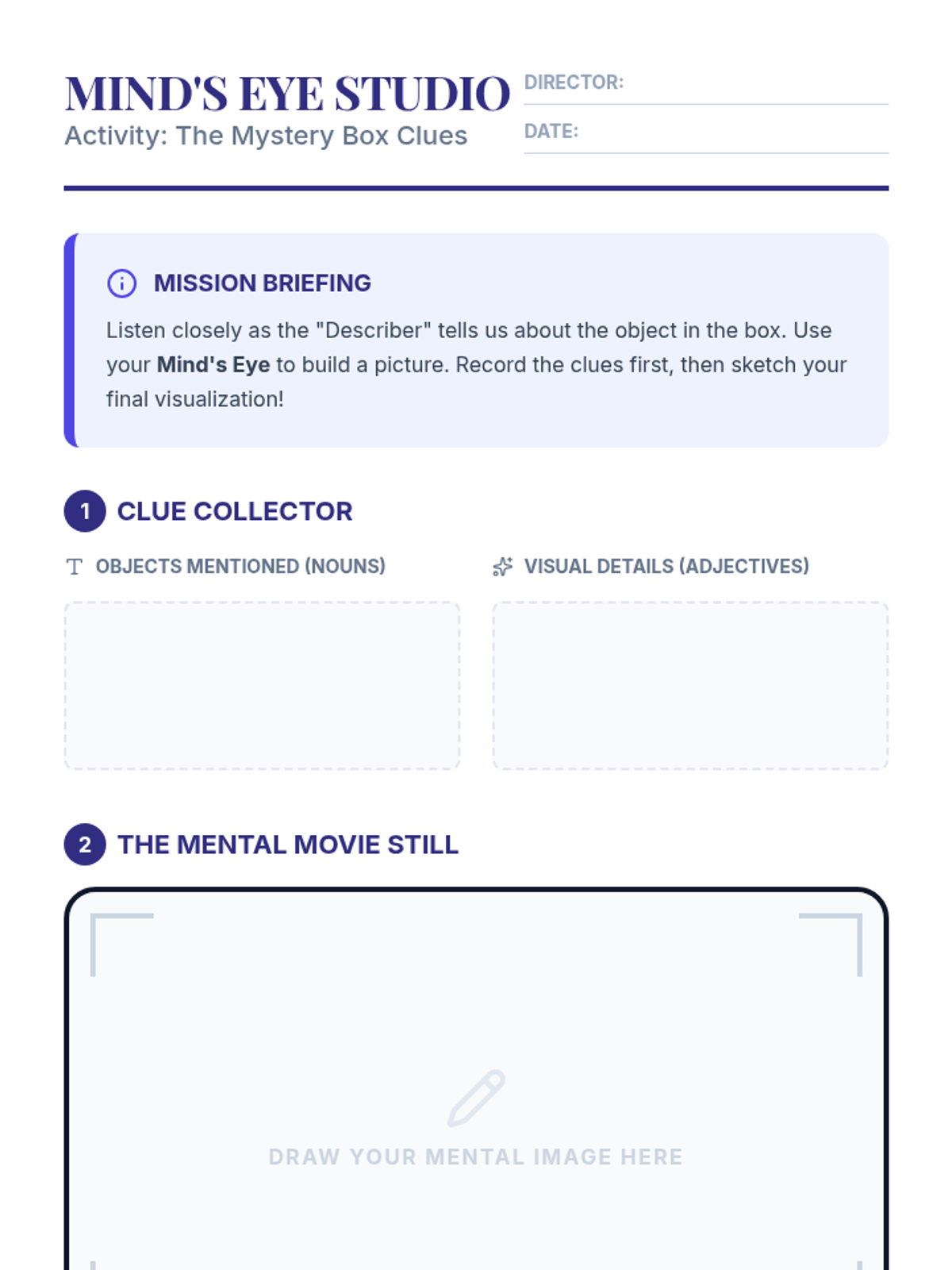 This 5th-grade sequence guides students through the 'Mind\'s Eye' technique, moving from simple object visualization to multi-sensory mental movies and storyboarding. It uses scaffolded workshops to build reading retention and comprehension for students requiring academic support.