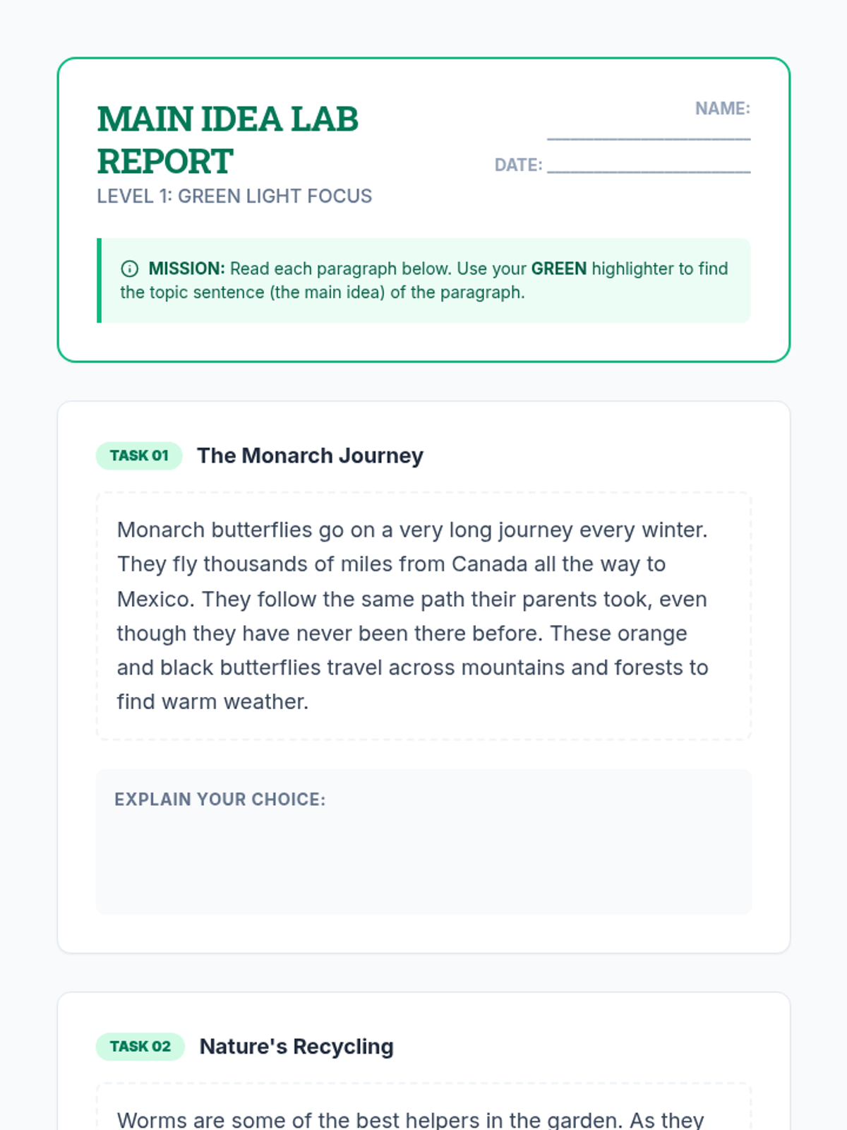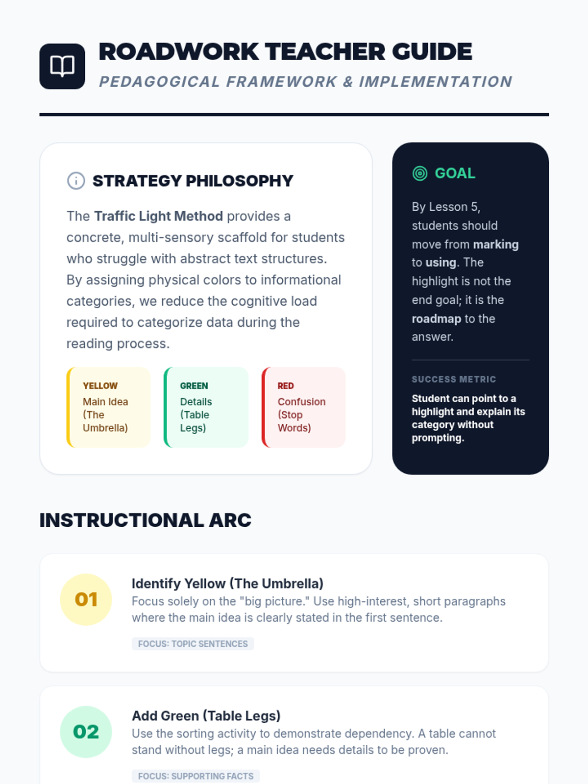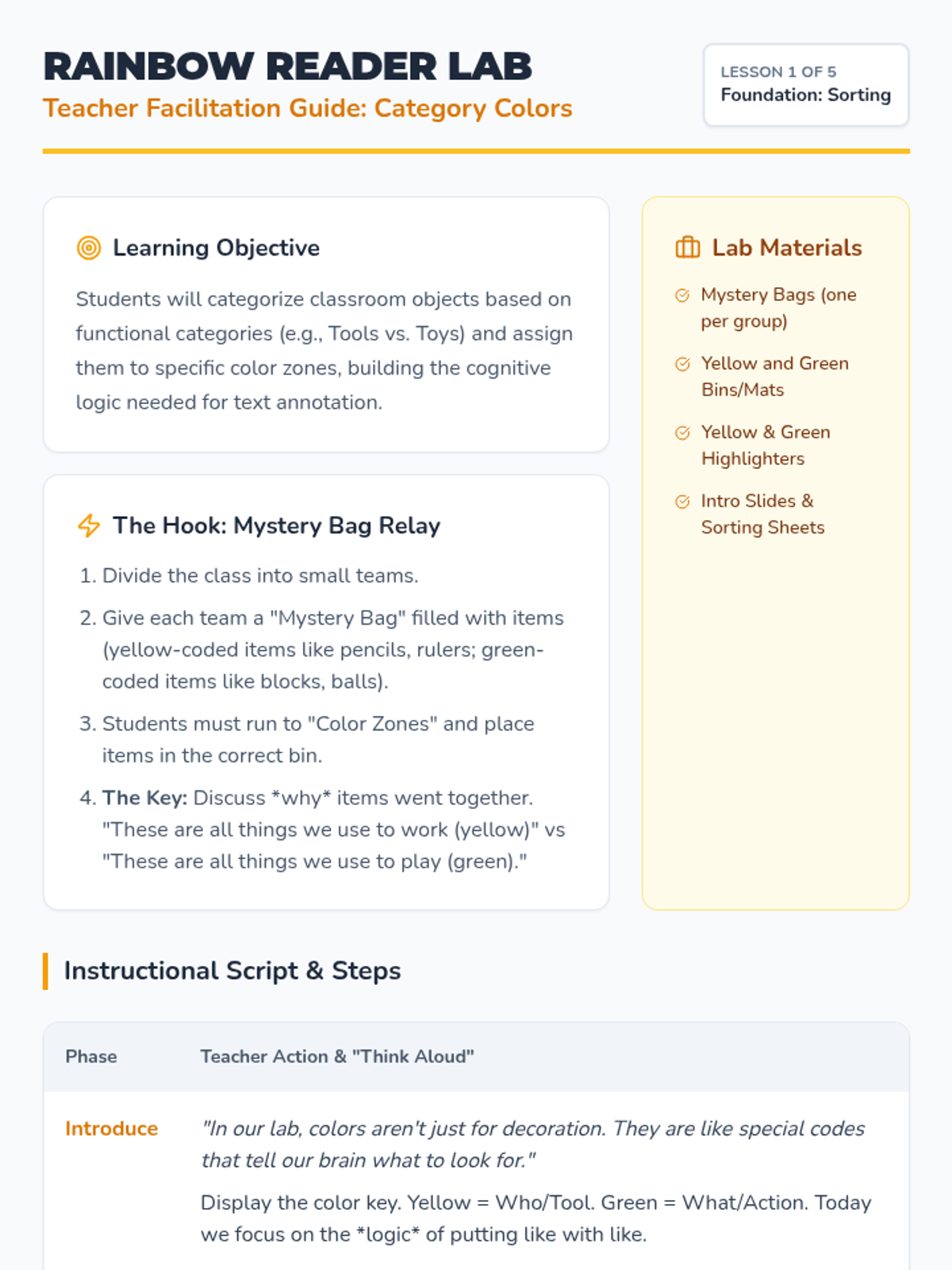 A multi-sensory, color-coded approach to reading comprehension. Students learn to systematically deconstruct informational texts using a tri-color system: green for main ideas, yellow for supporting details, and red for unknown vocabulary.