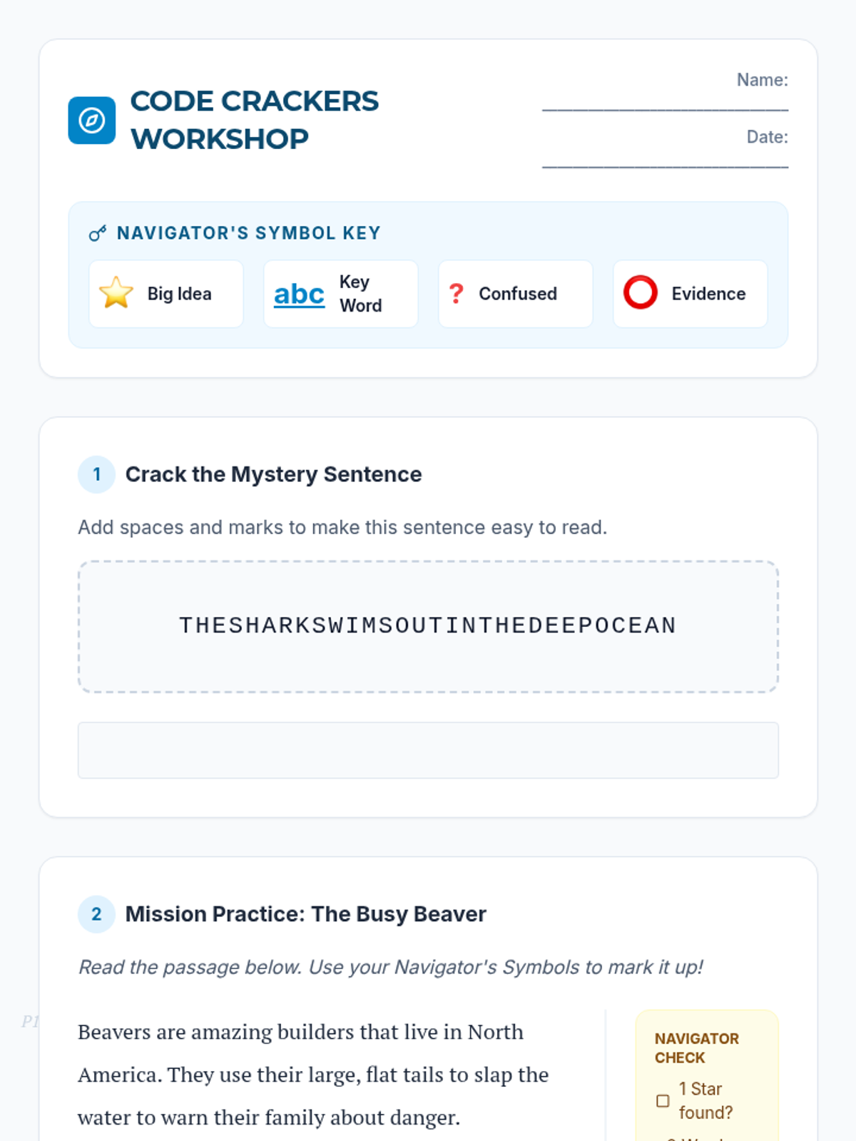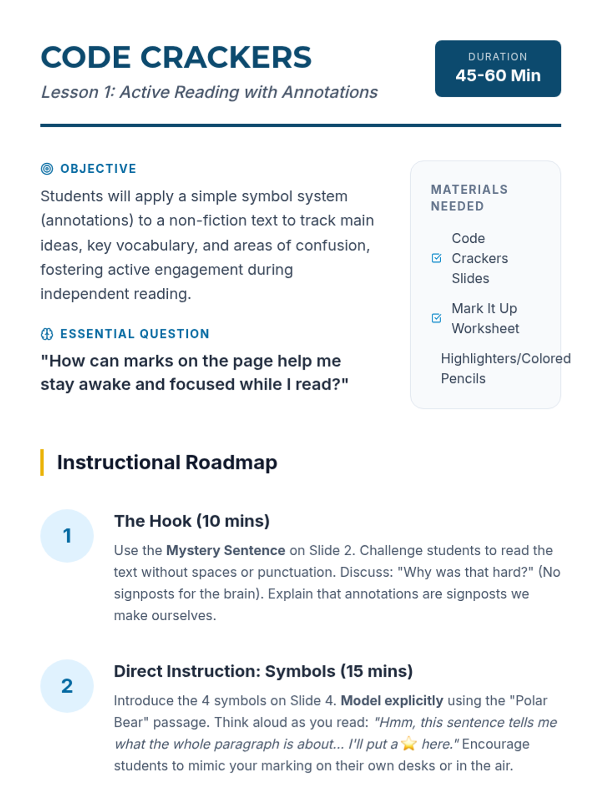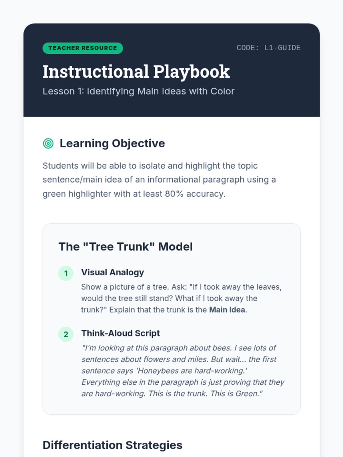 A multi-sensory, color-coded approach to reading comprehension. Students learn to systematically deconstruct informational texts using a tri-color system: green for main ideas, yellow for supporting details, and red for unknown vocabulary.