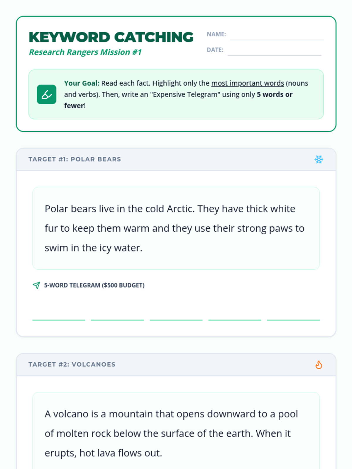 A workshop-style workshop sequence for 3rd grade ESL students focusing on note-taking and paraphrasing. Students learn to extract information without plagiarizing using strategies like keyword highlighting, visual sketching, and the 'Read-Cover-Write' method.