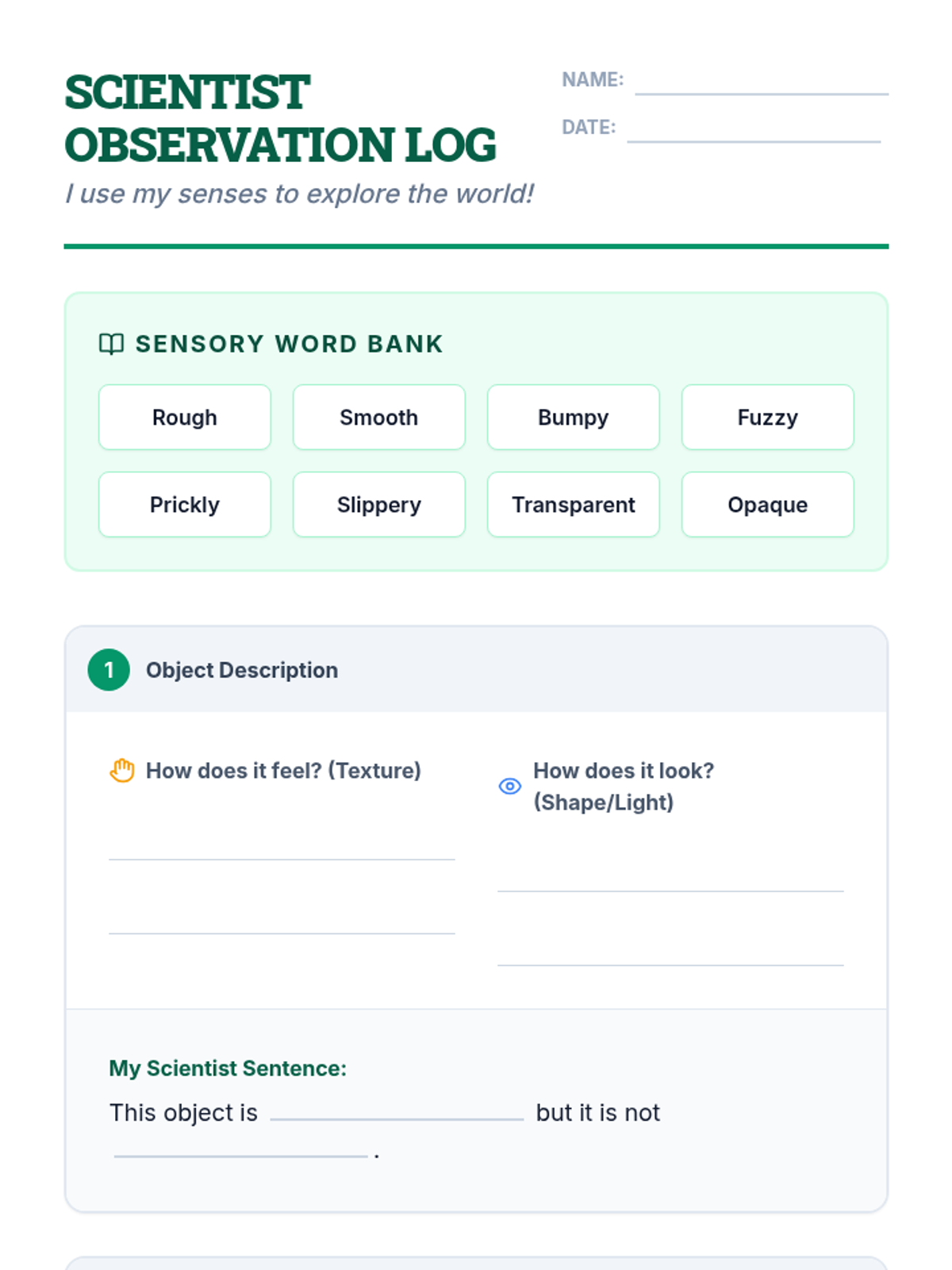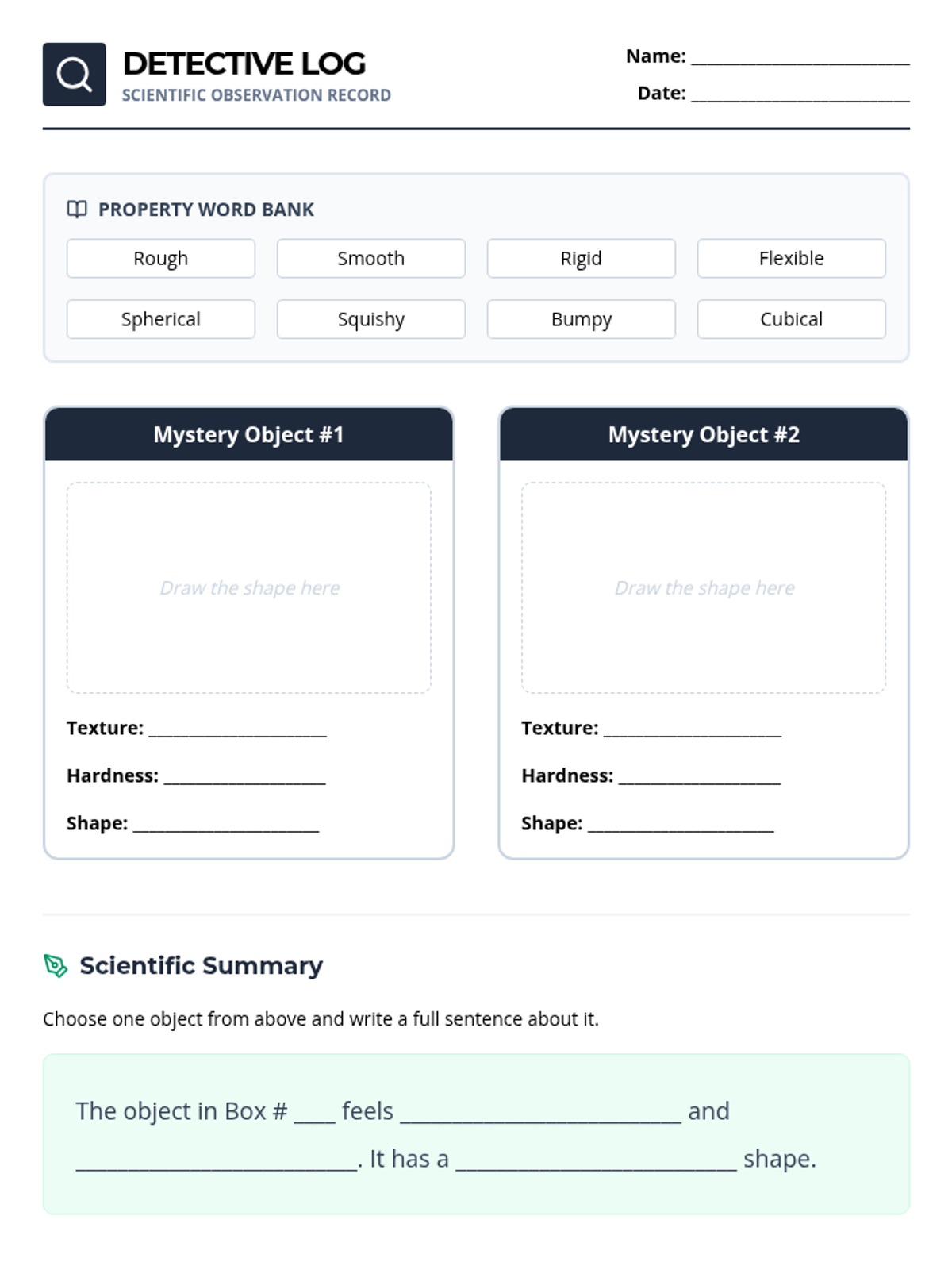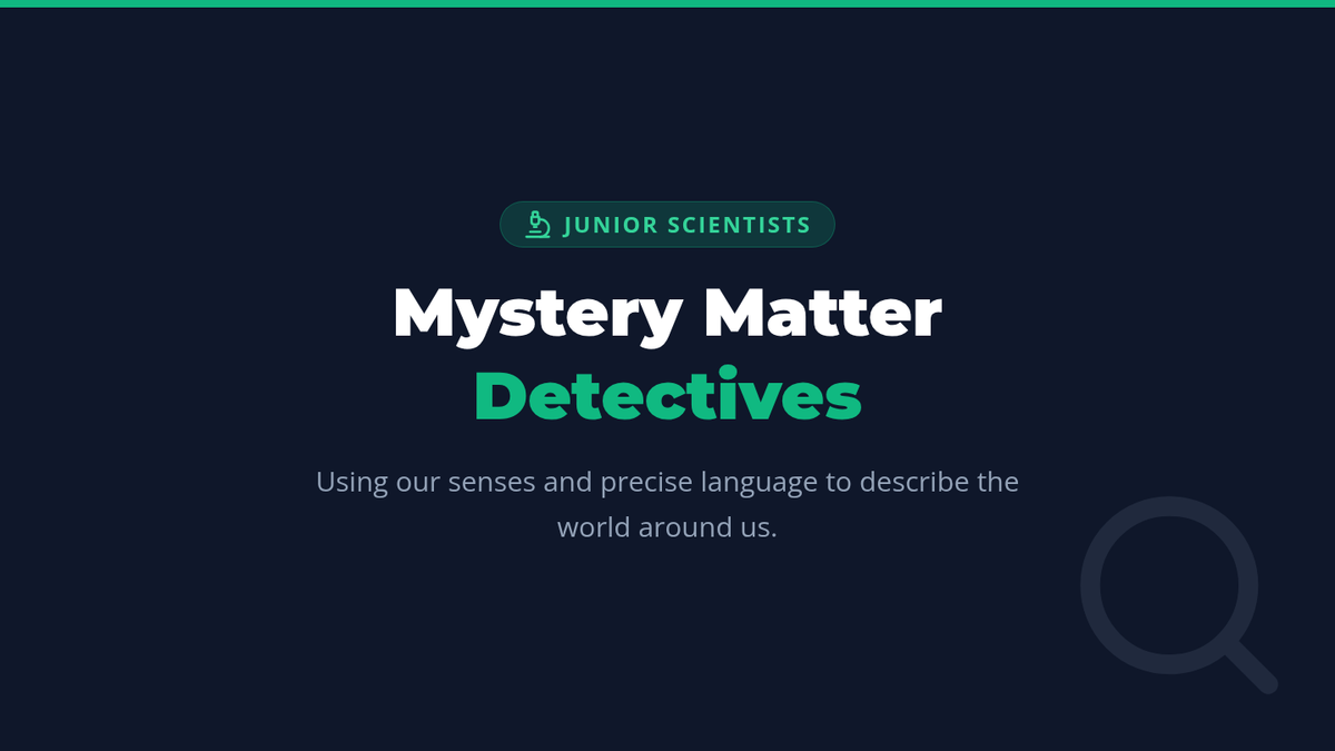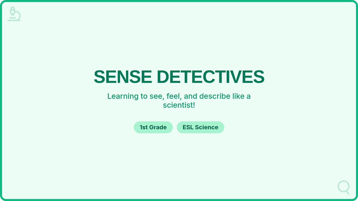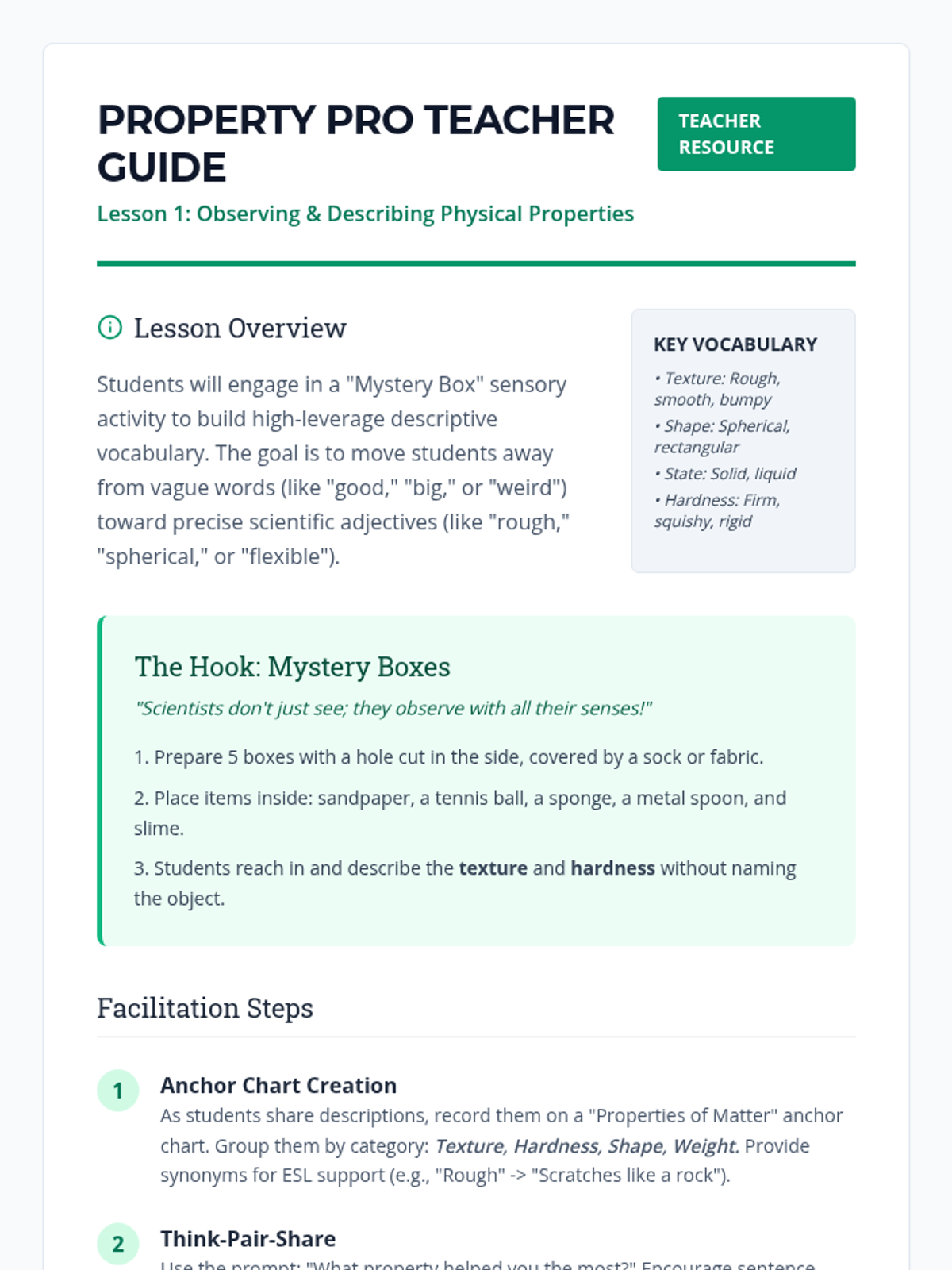 A 1st Grade ESL sequence focused on the language of scientific inquiry. Students learn to use precise sensory and classification vocabulary to describe physical properties of matter, culminating in a descriptive field guide.